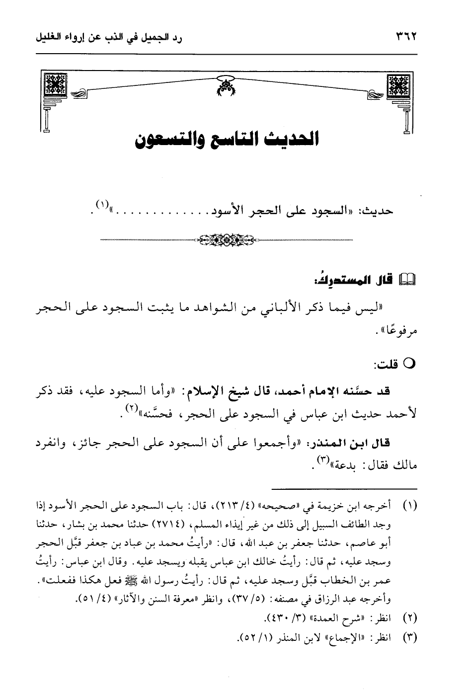 (¬1) أخرجه ابن خزيمة في "صحيحه" (4/ 213)، قال: باب السجود على الحجر الأسود إذا وجد الطائف السبيل إلى ذلك من غير إيذاء المسلم، (2714) حدثنا محمد بن بشار، حدثنا أبو عاصم، حدثنا جعفر بن عبد الله، قال: "رأيتُ محمد بن عباد بن جعفر قبَّل الحجر وسجد عليه، ثم قال: رأيتُ خالك ابن عباس يقبله ويسجد عليه. وقال ابن عباس: رأيتُ عمر بن الخطاب قبَّل وسجد عليه، ثم قال: رأيتُ رسول الله - صلى الله عليه وسلم - فعل هكذا ففعلت". وأخرجه عبد الرزاق في مصنفه: (5/ 37)، وانظر "معرفة السنن والآثار" (4/ 51).