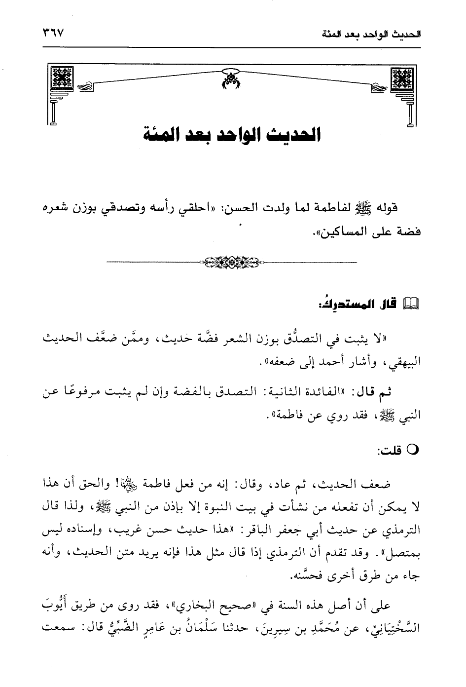 ضعف الحديث، ثم عاد، وقال: إنه من فعل فاطمة -رضي الله عنها-! والحق أن هذا لا يمكن أن تفعله من نشأت في بيت النبوة إلا بإذن من النبي - صلى الله عليه وسلم -، ولذا قال الترمذي عن حديث أبي جعفر الباقر: "هذا حديث حسن غريب، وإسناده ليس بمتصل". وقد تقدم أن الترمذي إذا قال مثل هذا فإنه يريد متن الحديث، وأنه جاء من طرق أخرى فحسَّنه.