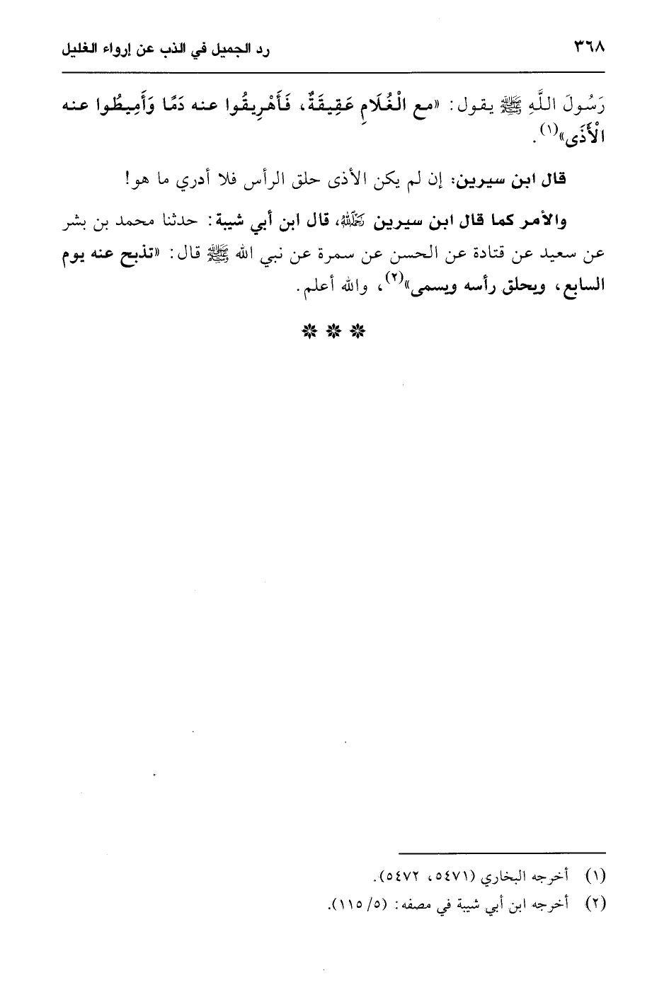 والأمر كما قال ابن سيرين رحمه الله، قال ابن أبي شيبة: حدثنا محمد بن بشر عن سعيد عن قتادة عن الحسن عن سمرة عن نبي الله - صلى الله عليه وسلم - قال: "تذبح عنه يوم السابع، ويحلق رأسه ويسمى" (¬2)، والله أعلم.