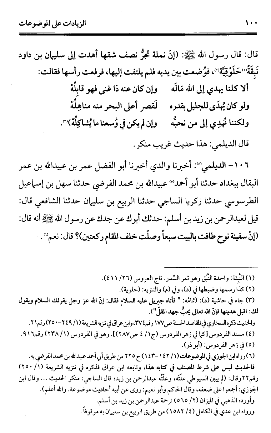 106 - الديلمي (¬1): أخبرنا والدي أخبرنا أبو الفضل عمر بن عبيد الله بن عمر البقال ببغداد حدثنا أبو أحمد (¬2) عبيد الله بن محمد الفرضي حدثنا سهل بن إسماعيل الطرسوسي حدثنا زكريا الساجي حدثنا الربيع بن سليمان حدثنا الشافعي قال: قيل لعبد الرحمن بن زيد بن أسلم: حدثك أبوك عن جدك عن رسول الله - صلى الله عليه وسلم - أنَّه قال: (إنّ سفينة نوح طافت بالبيت سبعًا وصلّت خلف المقام ركعتين)؟ قال: نعم (¬3).