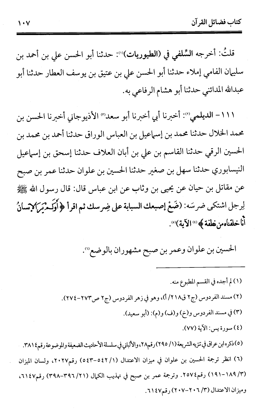 111 - الديلمي (¬1): أخبرنا أبب أخبرنا أبو سعد (¬2) الأذيوجاني أخبرنا الحسن بن محمد الخلال حدثنا محمد بن إسماعيل بن العباس الوراق حدثنا أحمد بن محمد بن الحسين الرقي حدثنا القاسم بن علي بن أبان العلاف حدثنا إسحاق بن إسماعيل النيسابوري حدثنا سهل بن صغير حدثنا الحسين بن علوان حدثنا عمر بن صبح عن مقاتل بن حيان عن يحيى بن وثاب عن ابن عباس قال: قال رسول الله - صلى الله عليه وسلم - لِرجل اشتكى ضرسَه: (ضَعْ إصبعك السبابة على ضِرسك ثم اقرأ {أَوَلَمْ يَرَ الْإِنْسَانُ أَنَّا خَلَقْنَاهُ مِنْ نُطْفَةٍ} (¬3) الآية) (¬4).