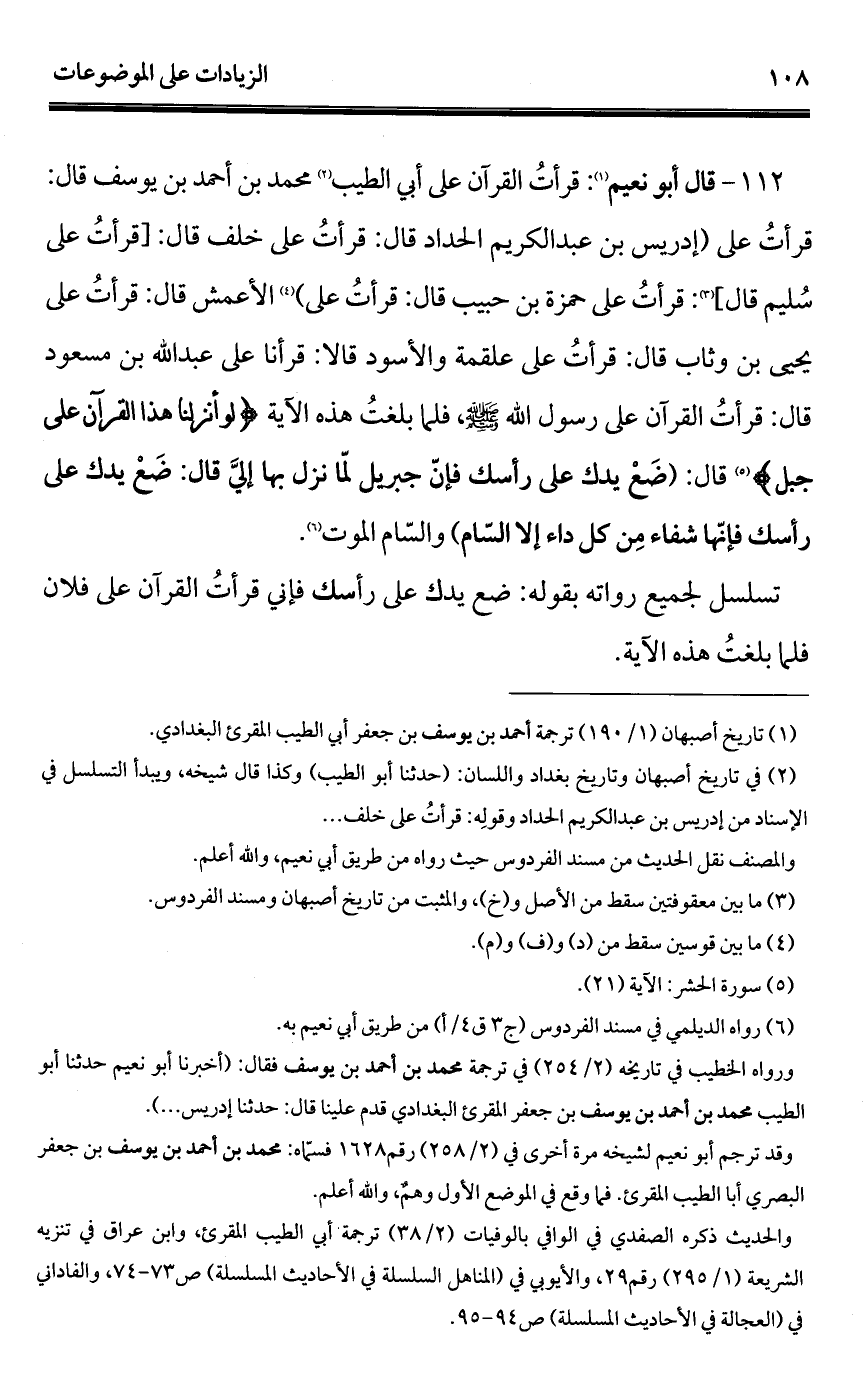 112 - قال أبو نعيم (¬1): قرأتُ القرآن على أبي الطيب (¬2) محمد بن أحمد بن يوسف قال: قرأتُ على (إدريس بن عبد الكريم الحداد قال: قرأتُ على خلف قال: [قرأتُ على سُليم قال] (¬3): قرأتُ على حمزة بن حبيب قال: قرأتُ على) (¬4) الأعمش قال: قرأتُ على يحيي بن وثاب قال: قرأتُ على علقمة والأسود قالا: قرأنا على عبد الله بن مسعود قال: قرأتُ القرآن على رسول الله - صلى الله عليه وسلم -، فلما بلغتُ هذه الآية {لَوْ أَنْزَلْنَا هَذَا الْقُرْآنَ عَلَى جَبَلٍ} (¬5) قال: (ضَعْ يدك على رأسك فإنّ جبريل لمّا نزل بها إليَّ قال: ضَعْ يدك على رأسك فإنّها شفاء مِن كل داء إلا السّام) والسّام الموت (¬6).