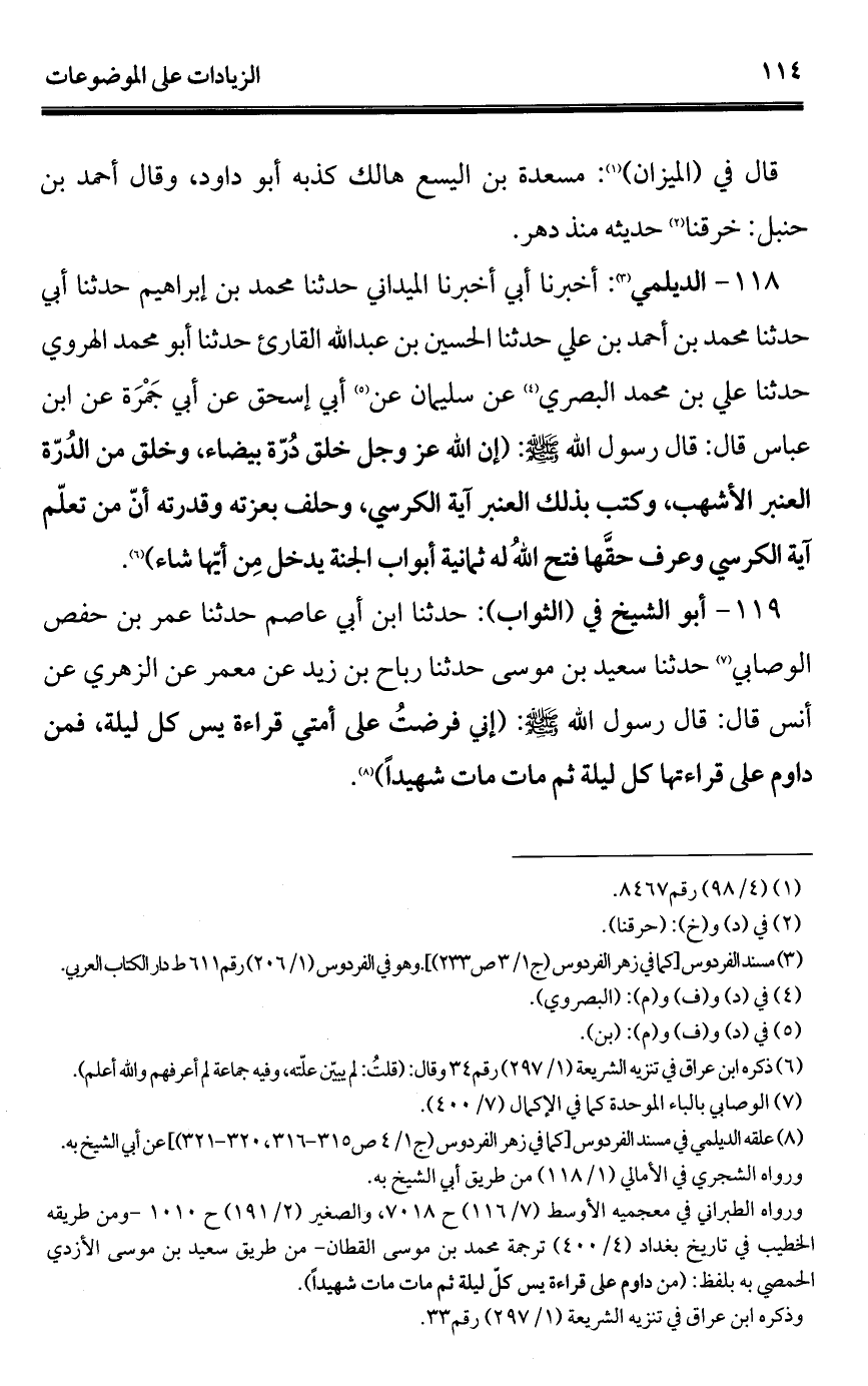 118 - الديلمي (¬1): أخبرنا أبي أخبرنا الميداني حدثنا محمد بن إبراهيم حدثنا أبي حدثنا محمد بن أحمد بن علي حدثنا الحسين بن عبد الله القارئ حدثنا أبو محمد الهروي حدثنا علي بن محمد البصري (¬2) عن سليمان عن (¬3) أبي إسحاق عن أبي جَمْرَة عن ابن عباس قال: قال رسول الله - صلى الله عليه وسلم -: (إن الله عز وجل خلق دُرّة بيضاء، وخلق من الدُرّة العنبر الأشهب، وكتب بذلك العنبر آية الكرسي، وحلف بعزته وقدرته أنّ من تعلّم آية الكرسي وعرف حقَّها فتح اللهُ له ثمانية أبواب الجنة يدخل مِن أيّها شاء) (¬4).