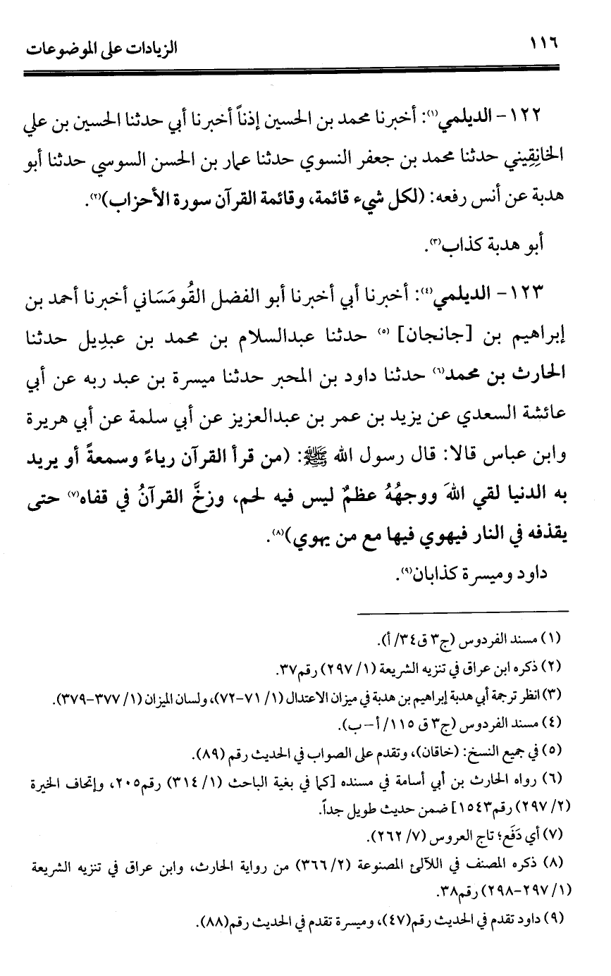 122 - الديلمي (¬1): أخبرنا محمد بن الحسين إذنًا أخبرنا أبي حدثنا الحسين بن علي الخانِقِيني حدثنا محمد بن جعفر النسوي حدثنا عمار بن الحسن السوسي حدثنا أبو هدبة عن أنس رفعه: (لكل شيء قائمة، وقائمة القرآن سورة الأحزاب) (¬2).
