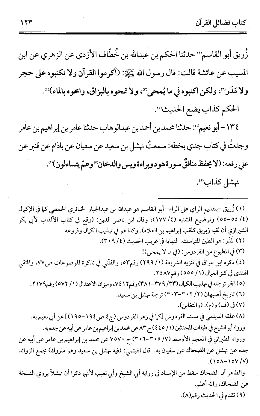 134 - أبو نعيم (¬1): حدثنا محمد بن أحمد بن عبد الوهاب حدثنا عامر بن إبراهيم بن عامر وجدتُ في كتاب جدي بخطه: سمعتُ نهشل بن سعيد عن سفيان عن باذام عن قنبر عن علي رفعه: (لا يحفظ منافقٌ سورة هود وبراءة ويس والدخان (¬2) وعمّ يتساءلون) (¬3).