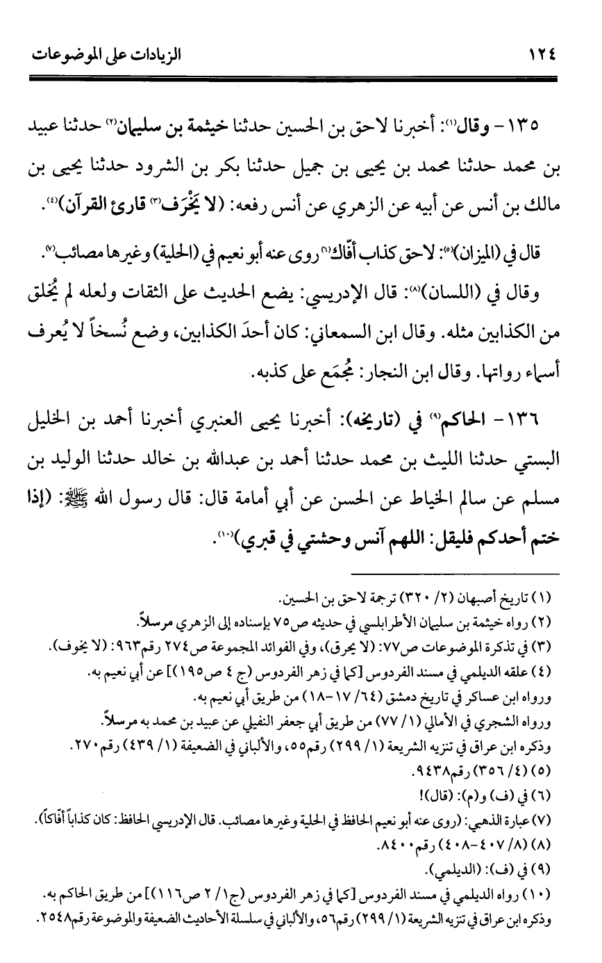 136 - الحاكم (¬1) في (تاريخه): أخبرنا يحيى العنبري أخبرنا أحمد بن الخليل البستي حدثنا الليث بن محمد حدثنا أحمد بن عبد الله بن خالد حدثنا الوليد بن مسلم عن سالم الخياط عن الحسن عن أبي أمامة قال: قال رسول الله - صلى الله عليه وسلم -: (إذا ختم أحدكم فليقل: اللهم آنس وحشتي في قبري) (¬2).