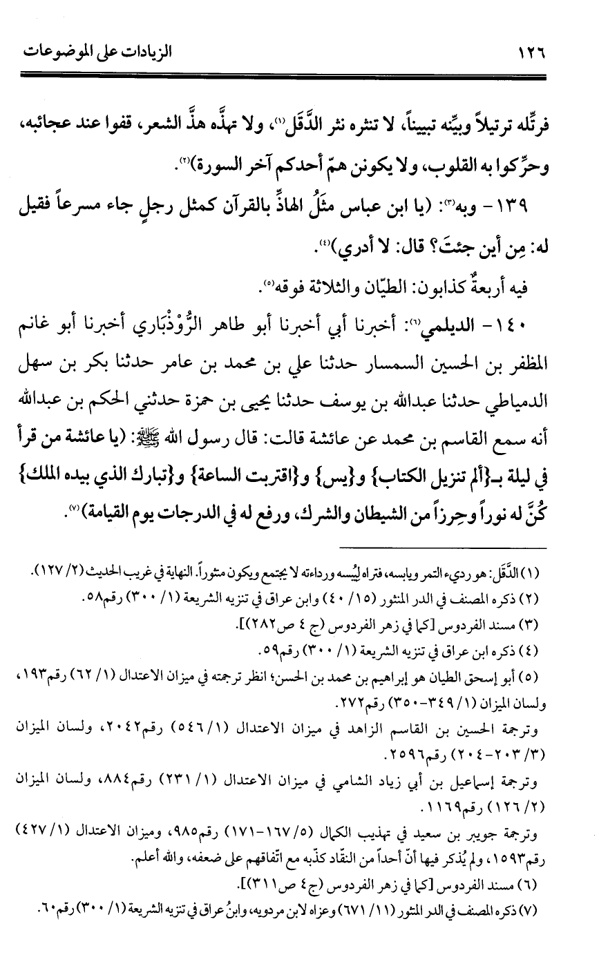140 - الديلمي (¬1): أخبرنا أبي أخبرنا أبو طاهر الرُّوْذْبَاري أخبرنا أبو غانم المظفر بن الحسين السمسار حدثنا علي بن محمد بن عامر حدثنا بكر بن سهل الدمياطي حدثنا عبد الله بن يوسف حدثنا يحيى بن حمزة حدثني الحكم بن عبد الله أنه سمع القاسم بن محمد عن عائشة قالت: قال رسول الله - صلى الله عليه وسلم -: (يا عائشة من قرأ في ليلة بـ {ألم تنزيل الكتاب} و [يس} و {اقتربت الساعة} و {تبارك الذي بيده الملك} كُنَّ له نورًا وحِرزًا من الشيطان والشرك، ورفع له في الدرجات يوم القيامة) (¬2).