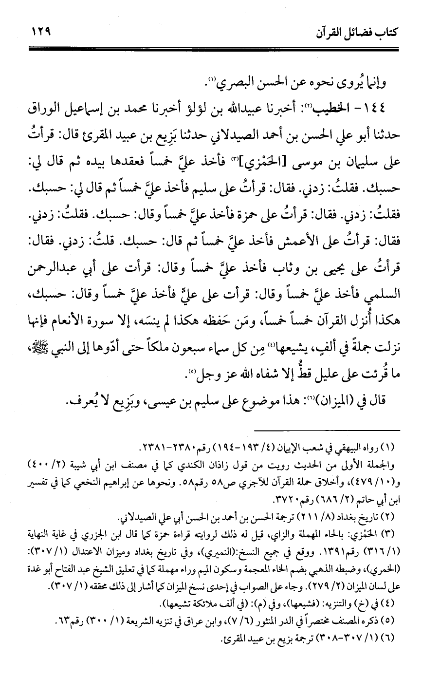 144 - الخطيب (¬1): أخبرنا عبيد الله بن لؤلؤ أخبرنا محمد بن إسماعيل الوراق حدثنا أبو علي الحسن بن أحمد الصيدلاني حدثنا بَزِيع بن عبيد المقرئ قال: قرأتُ على سليمان بن موسى [الحَمْزي] (¬2) فأخذ عليَّ خمسًا فعقدها بيده ثم قال لي: حسبك. فقلتُ: زدني. فقال: قرأتُ على سليم فأخذ عليَّ خمسًا ثم قال لي: حسبك. فقلتُ: زدني. فقال: قرأتُ على حمزة فأخذ عليَّ خمسًا وقال: حسبك. فقلتُ: زدني. فقال: قرأتُ على الأعمش فأخذ عليَّ خمسًا ثم قال: حسبك. قلتُ: زدني. فقال: قرأتُ على يحيى بن وثاب فأخذ عليَّ خمسًا وقال: قرأت على أبي عبد الرحمن السلمي فأخذ عليَّ خمسًا وقال: قرأت على عليٍّ فأخذ عليَّ خمسًا وقال: حسبك، هكذا أُنزل القرآن خمسًا خمسًا، ومَن حَفظه هكذا لم ينسَه، إلا سورة الأنعام فإنها نزلت جملةً في ألفٍ، يشيعها (¬3) مِن كل سماء سبعون ملكًا حتى أدّوها إلى النبي - صلى الله عليه وسلم -، ما قُرئت على عليل قطُّ إلا شفاه الله عز وجل (¬4).