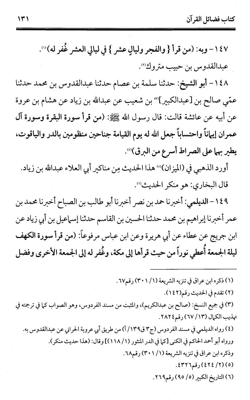 148 - أبو الشيخ: حدثنا سلمة بن عصام حدثنا عبد القدوس بن محمد حدثنا عمّي صالح بن [عبد الكبير] (¬1) بن شعيب عن عبد الله بن زياد عن هشام بن عروة عن أبيه عن عائشة قالت: قال رسول الله - صلى الله عليه وسلم -: (من قرأ سورة البقرة وسورة آل عمران إيمانًا واحتسابًا جعل الله له يوم القيامة جناحين منظومين بالدر والياقوت، يطير بهما على الصراط أسرع من البرق) (¬2).
