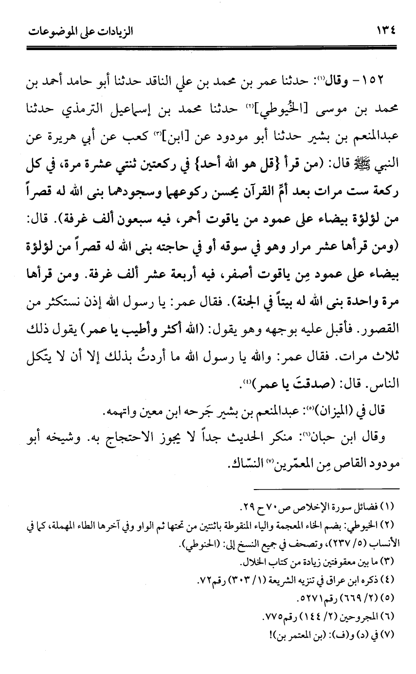 152 - وقال (¬1): حدثنا عمر بن محمد بن علي الناقد حدثنا أبو حامد أحمد بن محمد بن موسى [الخُيوطي] (¬2) حدثنا محمد بن إسماعيل الترمذي حدثنا عبد المنعم بن بشير حدثنا أبو مودود عن [ابن] (¬3) كعب عن أبي هريرة عن النبي - صلى الله عليه وسلم - قال: (من قرأ {قل هو الله أحد} في ركعتين ثنتي عشرة مرة، في كل ركعة ست مرات بعد أمِّ القرآن يحسن ركوعهما وسجودهما بنى الله له قصرًا من لؤلؤة بيضاء على عمود من ياقوت أحمر، فيه سبعون ألف غرفة). قال: (ومن قرأها عشر مرار وهو في سوقه أو في حاجته بنى الله له قصرًا من لؤلؤة بيضاء على عمود مِن ياقوت أصفر، فيه أربعة عشر ألف غرفة. ومن قرأها مرة واحدة بنى الله له بيتًا في الجنة). فقال عمر: يا رسول الله إذن نستكثر من القصور. فأقبل عليه بوجهه وهو يقول: (الله أكثر وأطيب يا عمر) يقول ذلك ثلاث مرات. فقال عمر: والله يا رسول الله ما أردتُ بذلك إلا أن لا يتّكل الناس. قال: (صدقتَ يا عمر) (¬4).