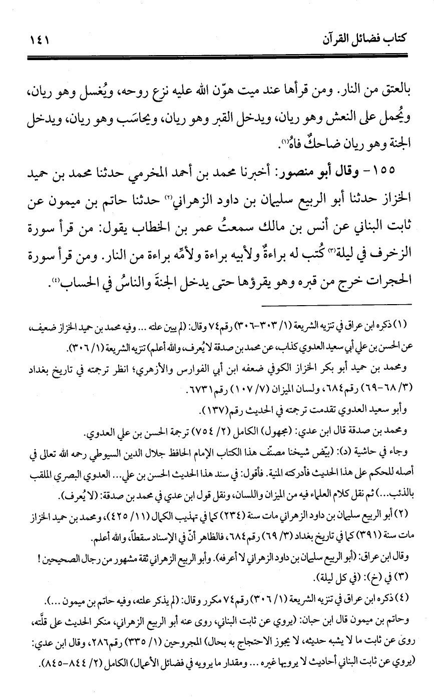 155 - وقال أبو منصور: أخبرنا محمد بن أحمد المخرمي حدثنا محمد بن حميد الخزاز حدثنا أبو الربيع سليمان بن داود الزهراني (¬1) حدثنا حاتم بن ميمون عن ثابت البناني عن أنس بن مالك سمعتُ عمر بن الخطاب يقول: من قرأ سورة الزخرف في ليلة (¬2) كُتب له براءةٌ ولأبيه براءة ولأمِّه براءة من النار. ومن قرأ سورة الحجرات خرج من قبره وهو يقرؤها حتى يدخل الجنةَ والناسُ في الحساب (¬3).
