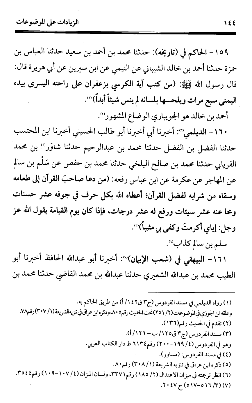 159 - الحاكم في (تاريخه): حدثنا محمد بن أحمد بن سعيد حدثنا العباس بن حمزة حدثنا أحمد بن خالد الشيباني عن التيمي عن ابن سيرين عن أبي هريرة قال: قال رسول الله - صلى الله عليه وسلم -: (من كتب آية الكرسي بزعفران على راحته اليسرى بيده اليمنى سبع مرات ويلحسها بلسانه لم ينس شيئًا أبدًا) (¬1).
