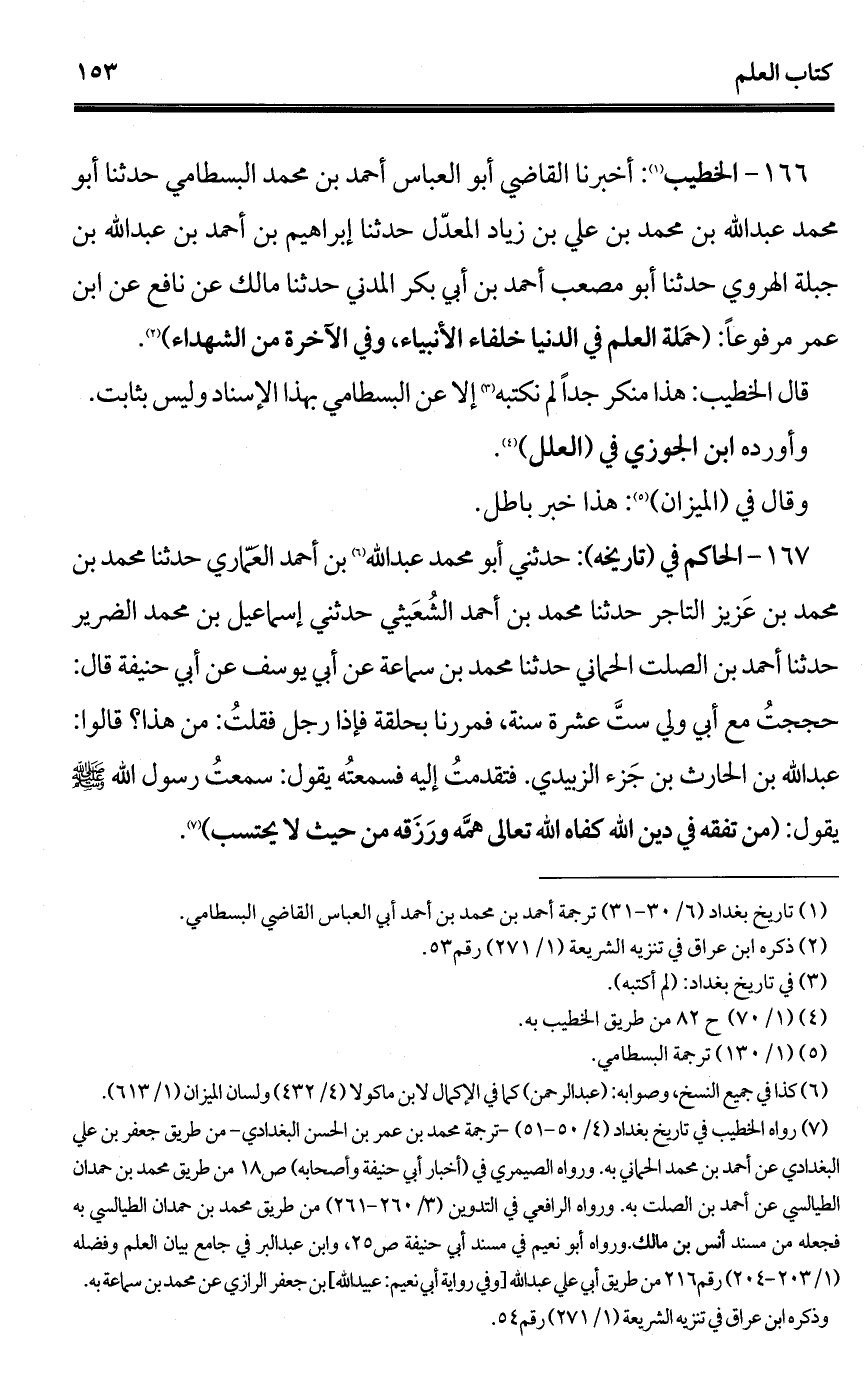 167 - الحاكم في (تاريخه): حدثني أبو محمد عبد الله (¬1) بن أحمد العَمّاري حدثنا محمد بن محمد بن عَزيز التاجر حدثنا محمد بن أحمد الشُّعَيثي حدثني إسماعيل بن محمد الضرير حدثنا أحمد بن الصلت الحماني حدثنا محمد بن سماعة عن أبي يوسف عن أبي حنيفة قال: حججتُ مع أبي ولي ستَّ عشرة سنة، فمررنا بحلقة فإذا رجل فقلتُ: من هذا؟ قالوا: عبد الله بن الحارث بن جَزء الزبيدي. فتقدمتُ إليه فسمعتُه يقول: سمعتُ رسول الله - صلى الله عليه وسلم - يقول: (من تفقه في دين الله كفاه الله تعالى همَّه ورَزَقه من حيث لا يحتسب) (¬2).