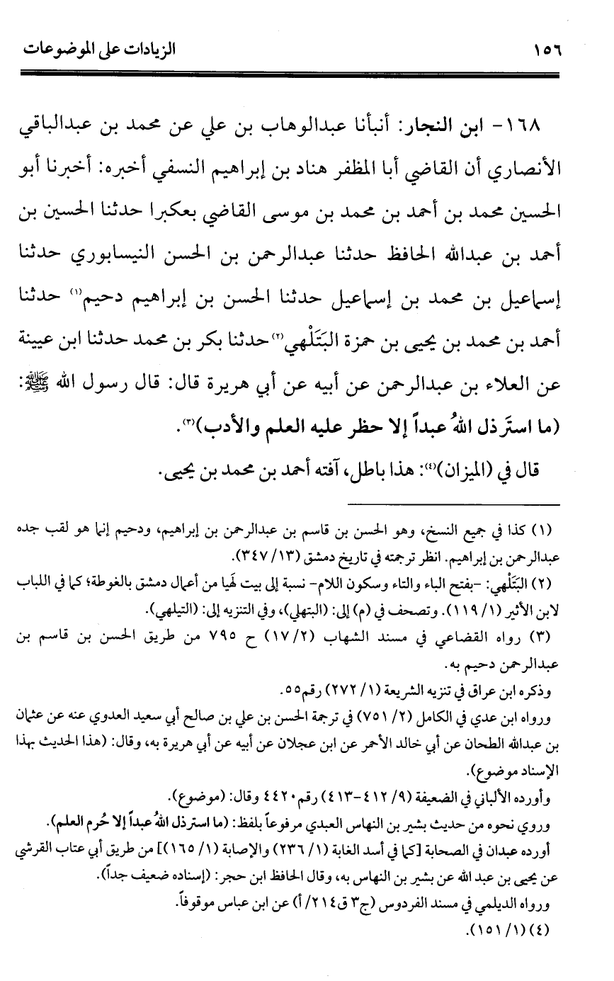 168 - ابن النجار: أنبأنا عبد الوهاب بن علي عن محمد بن عبد الباقي الأنصاري أن القاضي أبا المظفر هناد بن إبراهيم النسفي أخبره: أخبرنا أبو الحسين محمد بن أحمد بن محمد بن موسى القاضي بعكبرا حدثنا الحسين بن أحمد بن عبد الله الحافظ حدثنا عبد الرحمن بن الحسن النيسابوري حدثنا إسماعيل بن محمد بن إسماعيل حدثنا الحسن بن إبراهيم دحيم (¬1) حدثنا أحمد بن محمد بن يحيى بن حمزة البَتَلْهي (¬2) حدثنا بكر بن محمد حدثنا ابن عيينة عن العلاء بن عبد الرحمن عن أبيه عن أبي هريرة قال: قال رسول الله - صلى الله عليه وسلم -: (ما استَرذل اللهُ عبداً إلا حظر عليه العلم والأدب) (¬3).