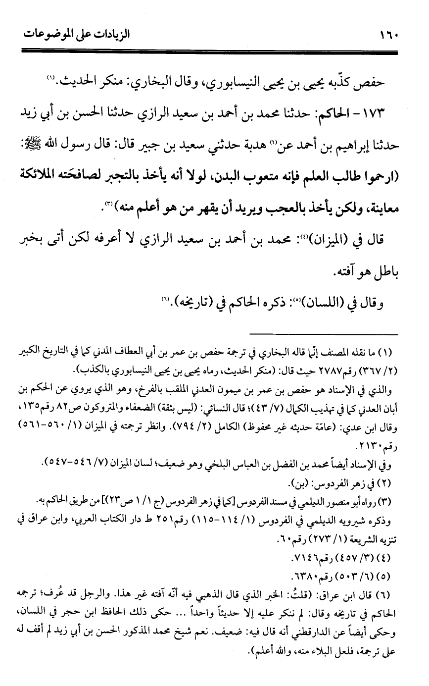 173 - الحاكم: حدثنا محمد بن أحمد بن سعيد الرازي حدثنا الحسن بن أبي زيد حدثنا إبراهيم بن أحمد عن (¬1) هدبة حدثني سعيد بن جبير قال: قال رسول الله - صلى الله عليه وسلم -: (ارحموا طالب العلم فإنه متعوب البدن، لولا أنه يأخذ بالتجبر لصافحَته الملائكة معاينة، ولكن يأخذ بالعجب ويريد أن يقهر من هو أعلم منه) (¬2).