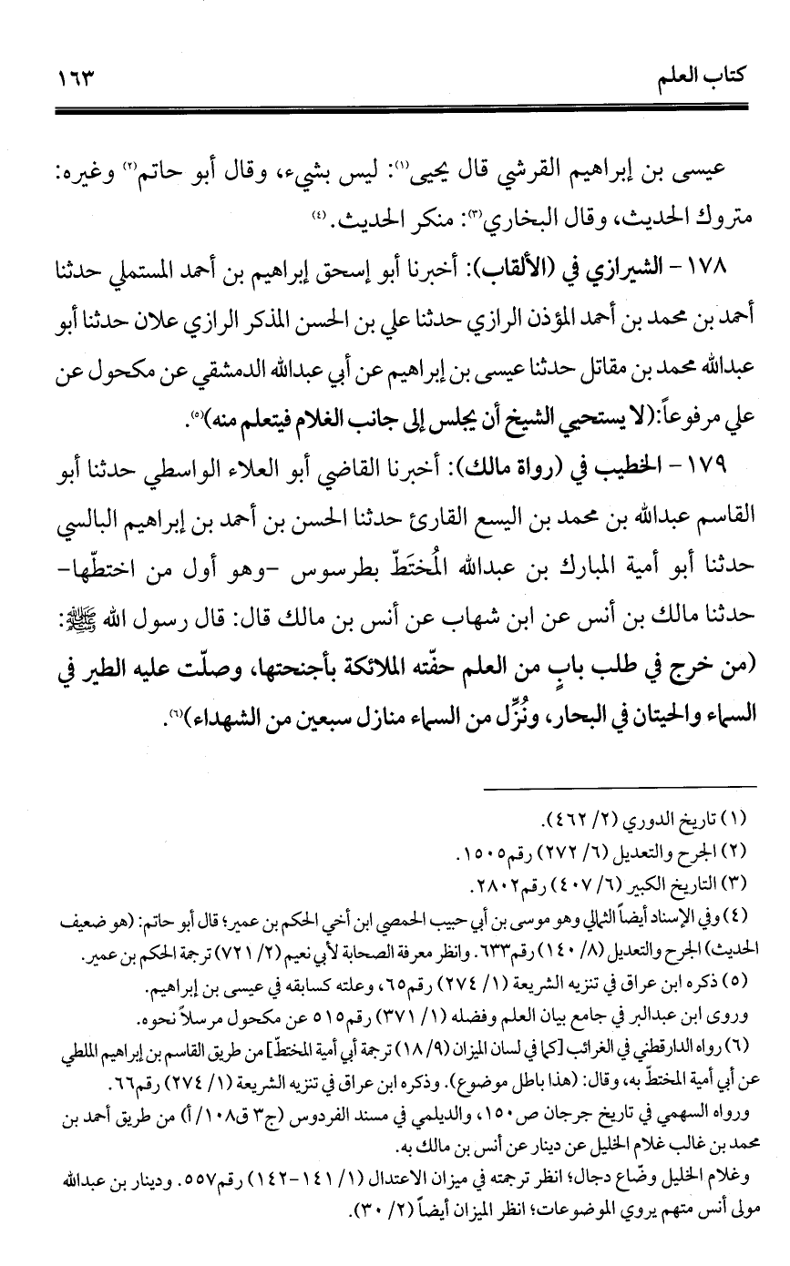 179 - الخطيب في (رواة مالك): أخبرنا القاضي أبو العلاء الواسطي حدثنا أبو القاسم عبد الله بن محمد بن اليسع القارئ حدثنا الحسن بن أحمد بن إبراهيم البالسي حدثنا أبو أمية المبارك بن عبد الله المُختَطّ بطرسوس -وهو أول من اختطّها- حدثنا مالك بن أنس عن ابن شهاب عن أنس بن مالك قال: قال رسول الله - صلى الله عليه وسلم -: (من خرج في طلب بابٍ من العلم حفّته الملاتكة بأجنحتها، وصلّت عليه الطير في السماء والحيتان في البحار، ونُزِّل من السماء منازل سبعين من الشهداء) (¬1).