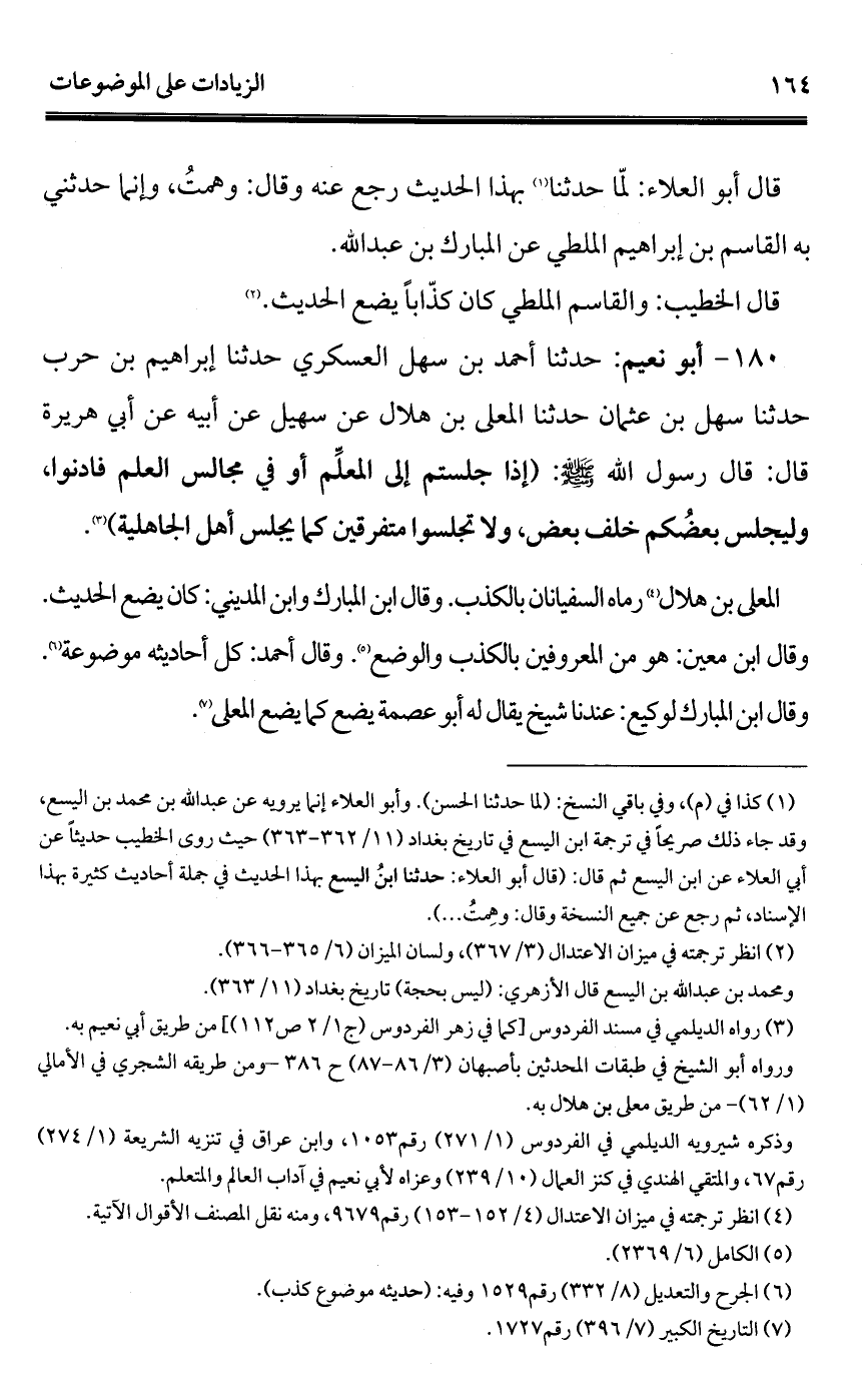 180 - أبو نعيم: حدثنا أحمد بن سهل العسكري حدثنا إبراهيم بن حرب حدثنا سهل بن عثمان حدثنا المعلى بن هلال عن سهيل عن أبيه عن أبي هريرة قال: قال رسول الله - صلى الله عليه وسلم -: (إذا جلستم إلى المعلِّم أو في مجالس العلم فادنوا، وليجلس بعضُكم خلف بعض، ولا تجلسوا متفرقين كما يجلس أهل الجاهلية) (¬1).