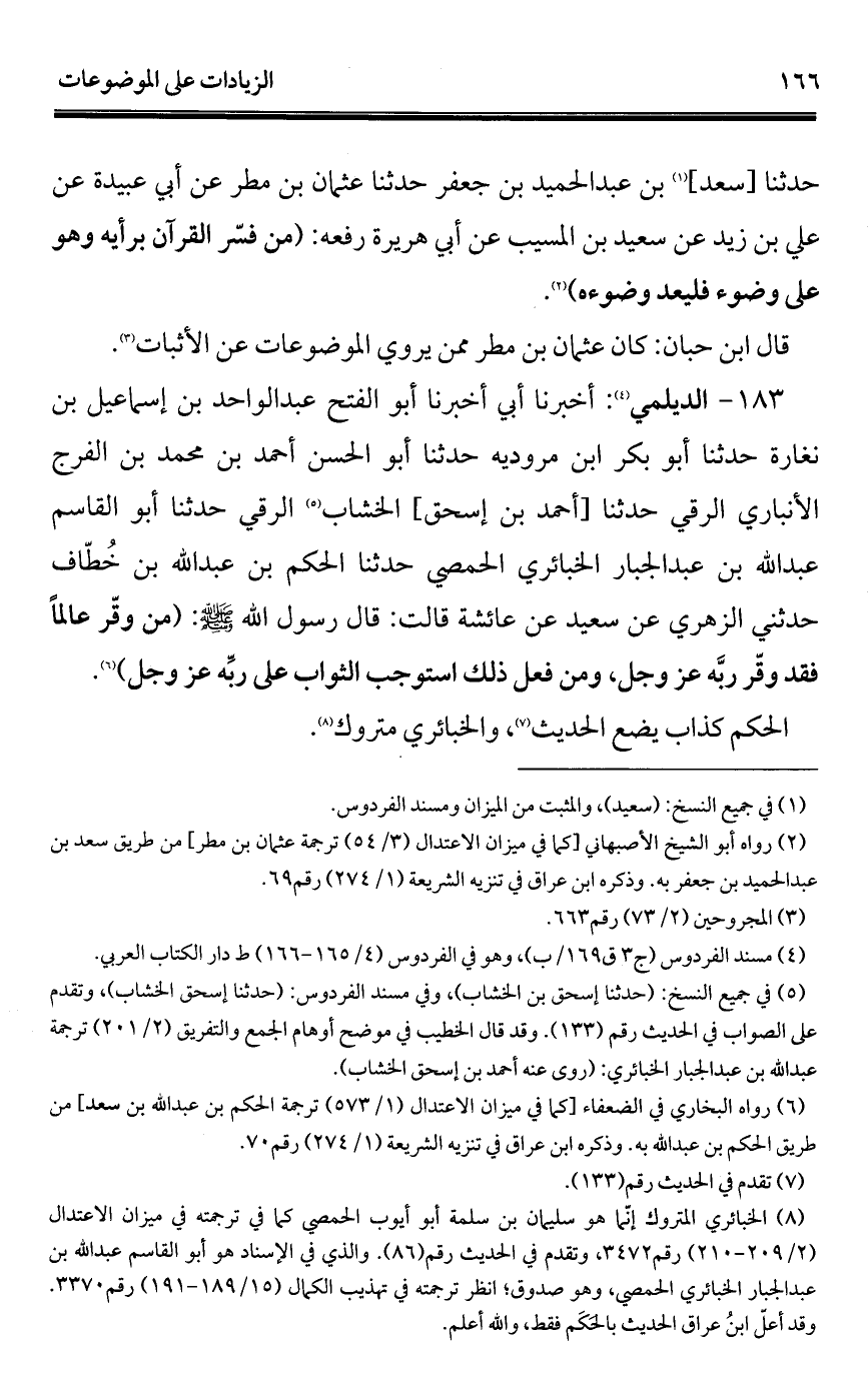 (¬5) الخبائري المتروك إنّما هو سليمان بن سلمة أبو أيوب الحمصي كما في ترجمته في ميزان الاعتدال (2/ 209 - 210) رقم 3472، وتقدم في الحديث رقم (86). والذي في الإسناد هو أبو القاسم عبد الله بن عبد الجبار الخبائري الحمصي، وهو صدوق؛ انظر ترجمته في تهذيب الكمال (15/ 189 - 191) رقم 3370. وقد أعلّ ابنُ عراق الحديث بالحَكَم فقط، والله أعلم.