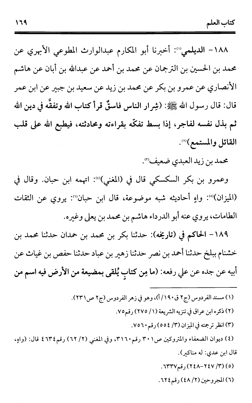 188 - الديلمي (¬1): أخبرنا أبو المكارم عبد الوارث المطوعي الأبهري عن محمد بن الحسين بن الترجمان عن محمد بن أحمد عن عبد الله بن أبان عن هاشم الأنصاري عن عمرو بن بكر عن محمد بن زيد عن سعيد بن جبير عن ابن عمر قال: قال رسول الله - صلى الله عليه وسلم -: (شِرار الناس فاسقٌ قرأ كتاب الله وتفقَّه في دين الله ثم بذل نفسه لفاجر، إذا بسط تفكّه بقراءته ومحادثته، فيطبع الله على قلب القائل والمستمع) (¬2).