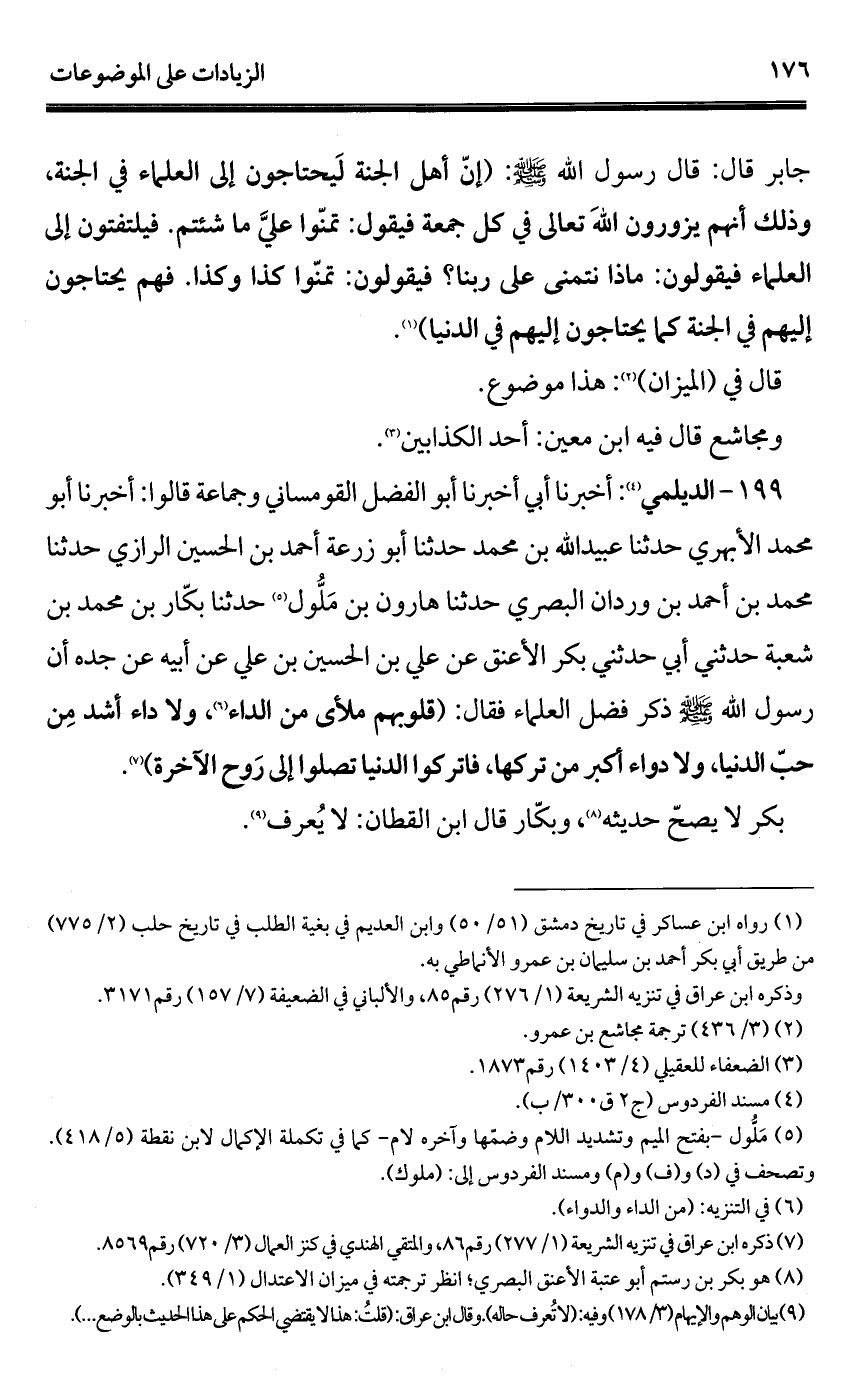 199 - الديلمي (¬1): أخبرنا أبي أخبرنا أبو الفضل القومساني وجماعة قالوا: أخبرنا أبو محمد الأبهري حدثنا عبيد الله بن محمد حدثنا أبو زرعة أحمد بن الحسين الرازي حدثنا محمد بن أحمد بن وردان البصري حدثنا هارون بن مَلُّول (¬2) حدثنا بكّار بن محمد بن شعبة حدثني أبي حدثني بكر الأعنق عن علي بن الحسين بن علي عن أبيه عن جده أن رسول الله - صلى الله عليه وسلم - ذكر فضل العلماء فقال: (قلوبهم ملأى من الداء (¬3)، ولا داء أشد مِن حبّ الدنيا، ولا دواء أكبر من تركها، فاتركوا الدنيا تصلوا إلى رَوح الآخرة) (¬4).