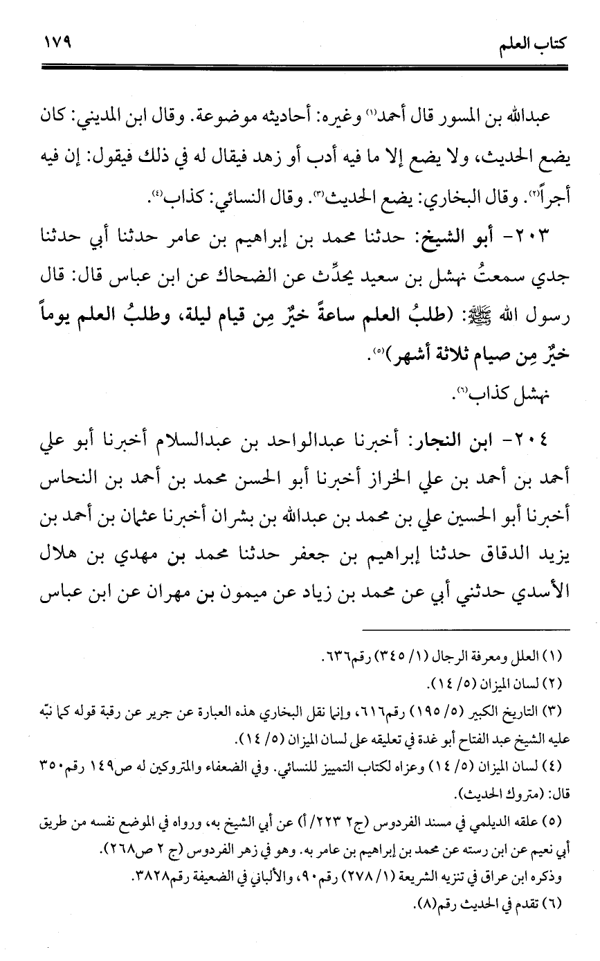 203 - أبو الشيخ: حدثنا محمد بن إبراهيم بن عامر حدثنا أبي حدثنا جدي سمعتُ نهشل بن سعيد يحدِّث عن الضحاك عن ابن عباس قال: قال رسول الله - صلى الله عليه وسلم -: (طلبُ العلم ساعةً خيرٌ مِن قيام ليلة، وطلبُ العلم يوماً خيرٌ مِن صيام ثلاثة أشهر) (¬1).