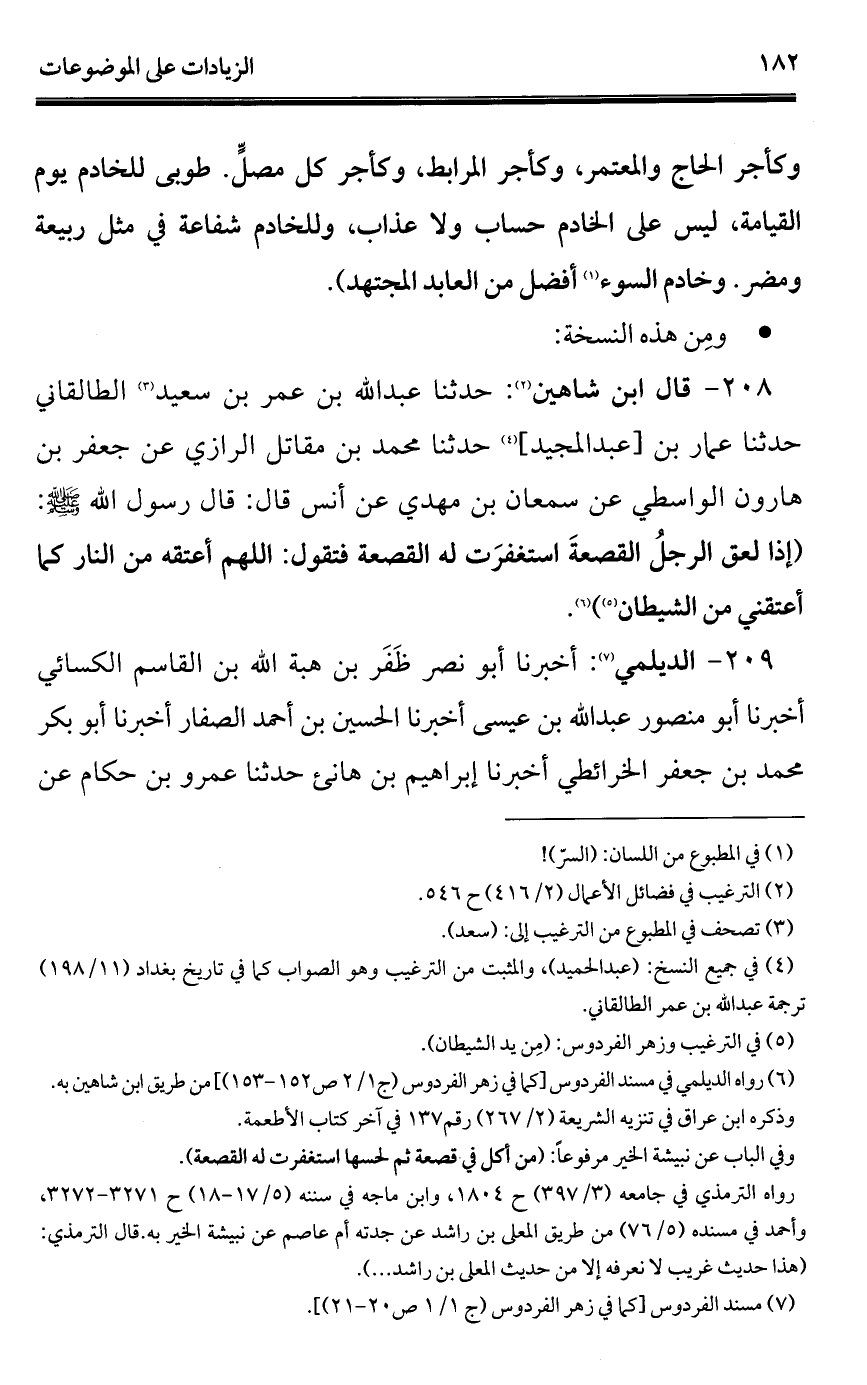 208 - قال ابن شاهين (¬1): حدثنا عبد الله بن عمر بن سعيد (¬2) الطالقاني حدثنا عمار بن [عبد المجيد] (¬3) حدثنا محمد بن مقاتل الرازي عن جعفر بن هارون الواسطي عن سمعان بن مهدي عن أنس قال: قال رسول الله - صلى الله عليه وسلم -: (إذا لعق الرجلُ القصعةَ استغفرَت له القصعة فتقول: اللهم أعتقه من النار كما أعتقني من الشيطان) (¬4) (¬5).