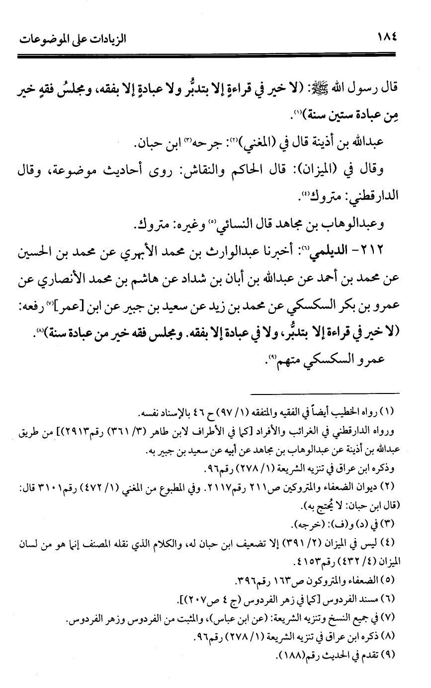 212 - الديلمي (¬1): أخبرنا عبد الوارث بن محمد الأبهري عن محمد بن الحسين عن محمد بن أحمد عن عبد الله بن أبان بن شداد عن هاشم بن محمد الأنصاري عن عمرو بن بكر السكسكي عن محمد بن زيد عن سعيد بن جبير عن ابن [عمر] (¬2) رفعه: (لا خير في قراءة إلا بتدبُّر، ولا في عبادة إلا بفقه. ومجلس فقه خير من عبادة سنة) (¬3).
