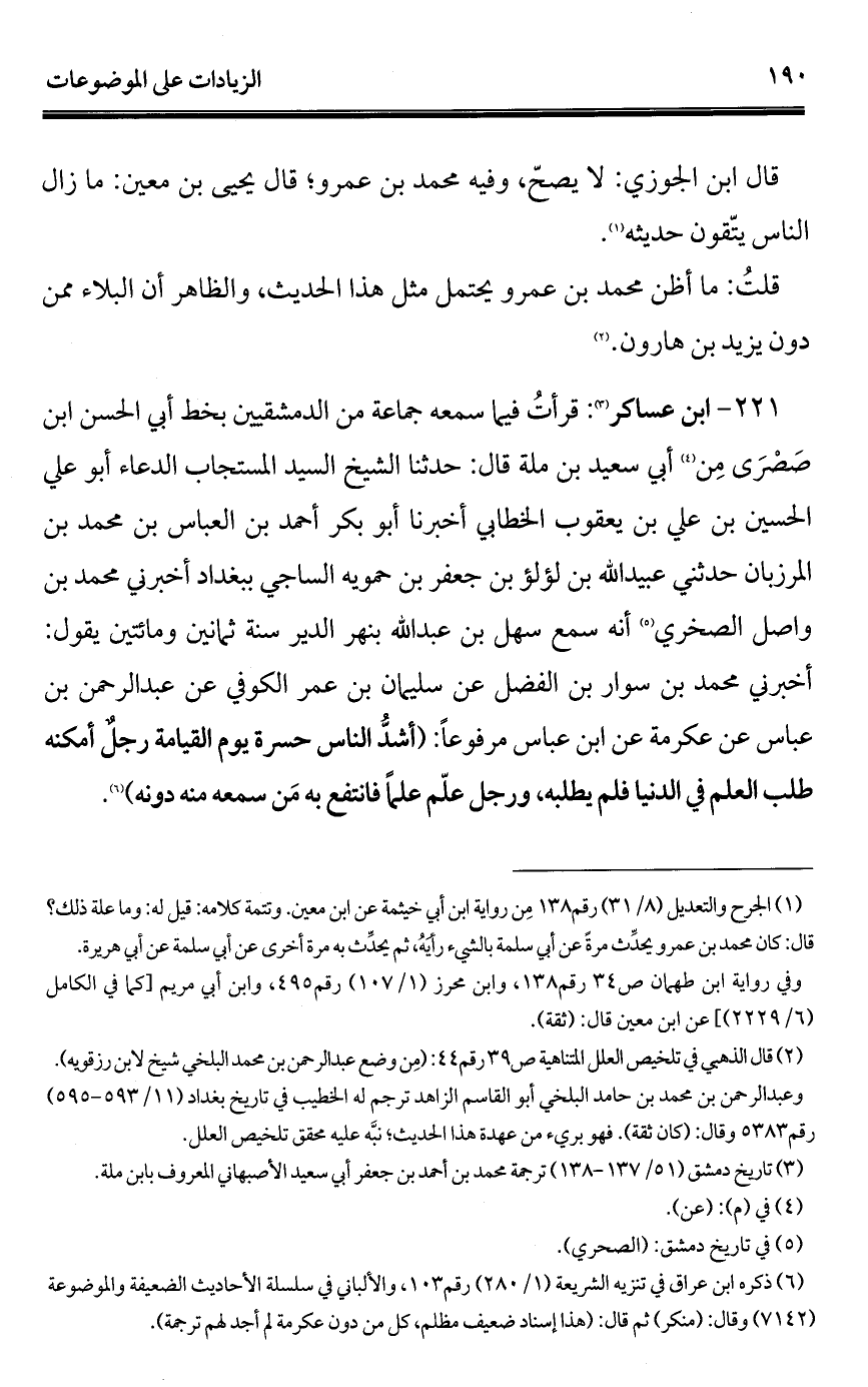 221 - ابن عساكر (¬1): قرأتُ فيما سمعه جماعة من الدمشقيين بخط أبي الحسن ابن صَصْرَى مِن (¬2) أبي سعيد بن ملة قال: حدثنا الشيخ السيد المستجاب الدعاء أبو علي الحسين بن علي بن يعقوب الخطابي أخبرنا أبو بكر أحمد بن العباس بن محمد بن المرزبان حدثني عبيد الله بن لؤلؤ بن جعفر بن حمويه الساجي ببغداد أخبرني محمد بن واصل الصخري (¬3) أنه سمع سهل بن عبد الله بنهر الدير سنة ثمانين ومائتين يقول: أخبرني محمد بن سوار بن الفضل عن سليمان بن عمر الكوفي عن عبد الرحمن بن عباس عن عكرمة عن ابن عباس مرفوعاً: (أشدُّ الناس حسرة يوم القيامة رجلٌ أمكنه طلب العلم في الدنيا فلم يطلبه، ورجل علّم علماً فانتفع به مَن سمعه منه دونه) (¬4).
