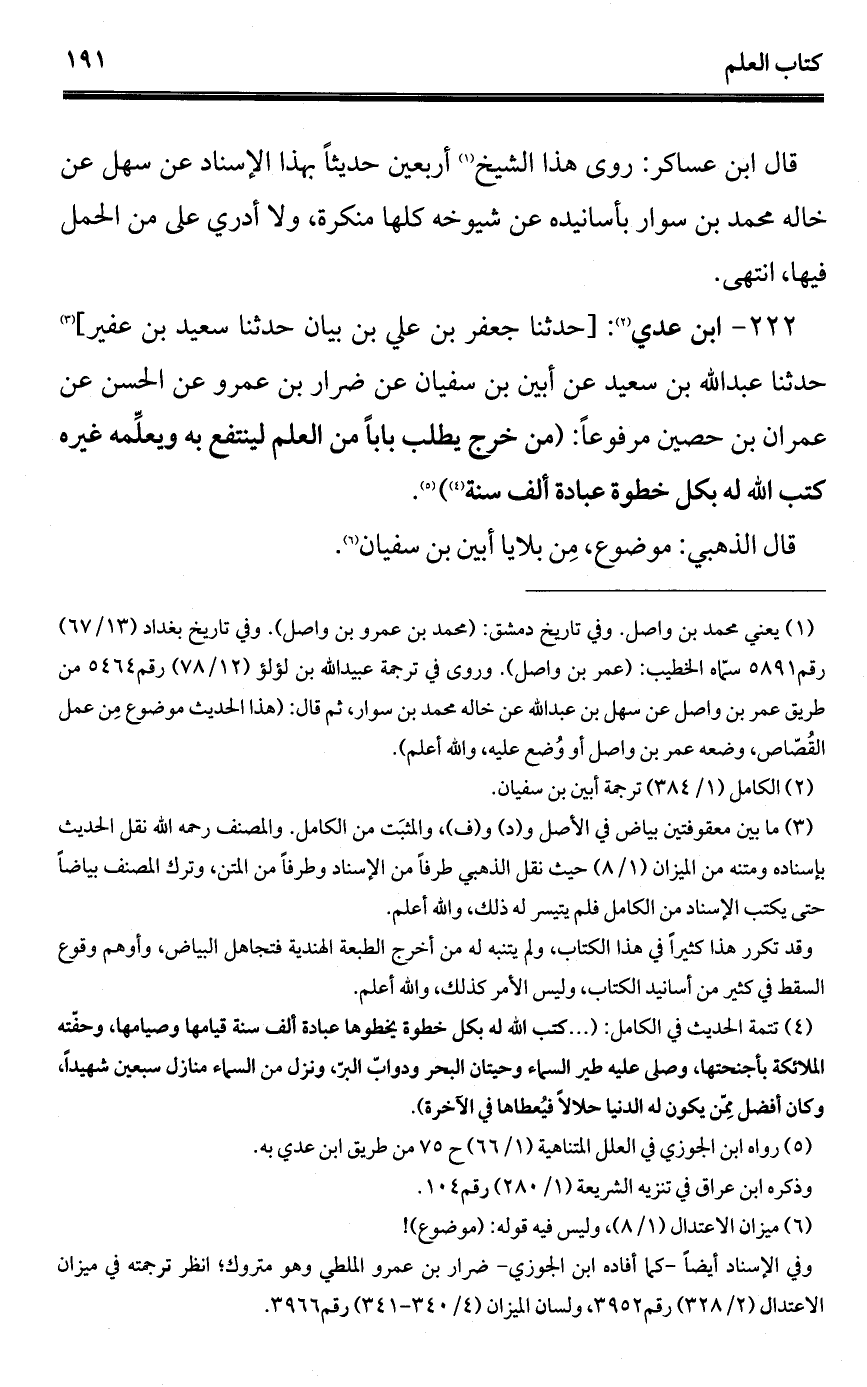 222 - ابن عدي (¬1): [حدثنا جعفر بن علي بن بيان حدثنا سعيد بن عفير] (¬2) حدثنا عبد الله بن سعيد عن أبين بن سفيان عن ضرار بن عمرو عن الحسن عن عمران بن حصين مرفوعاً: (من خرج يطلب باباً من العلم لينتفع به ويعلِّمه غيره كتب الله له بكل خطوة عبادة ألف سنة) (¬3) (¬4).