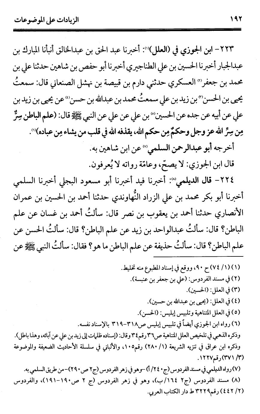 223 - ابن الجوزي في (العلل) (¬1): أخبرنا عبد الحق بن عبد الخالق أنبأنا المبارك بن عبد الجبار أخبرنا الحسين بن علي الطناجيري أخبرنا أبو حفص بن شاهين حدثنا علي بن محمد بن جعفر (¬2) العسكري حدثني دارم بن قبيصة بن نهشل الصنعاني قال: سمعتُ يحيى بن الحسن (¬3) بن زيد بن علي سمعتُ محمد بن عبد الله بن حسن (¬4) عن يحيى بن زيد بن علي عن أبيه عن جده عن الحسين (¬5) بن علي عن علي عن النبي - صلى الله عليه وسلم - قال: (علم الباطن سِرٌّ مِن سِرِّ الله عز وجل وحكمٌ مِن حكم الله، يقذفه الله في قلب من يشاء مِن عباده) (¬6).
