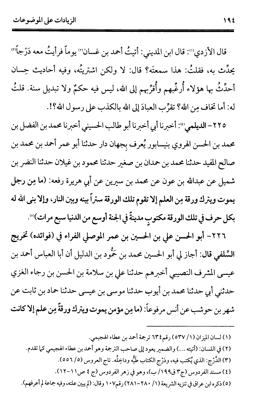 225 - الديلمي (¬1): أخبرنا أبي أخبرنا أبو طالب الحسيني أخبرنا محمد بن الفضل بن محمد بن الحسن الهروي بنيسابور يُعرف بِجهان دار حدثنا أبو عمر أحمد بن محمد بن صالح المفيد حدثنا محمد بن حمدان بن صغير حدثنا محمود بن غيلان حدثنا النضر بن شميل عن عبد الله بن عون عن محمد بن سيرين عن أبي هريرة رفعه: (ما مِن رجل يموت ويترك ورقة مِن العلم إلا تقوم تلك الورقة ستراً بينه وبين النار، وإلا بنى الله له بكل حرف في تلك الورقة مكتوبٍ مدينةً في الجنة أوسع من الدنيا سبع مرات) (¬2).