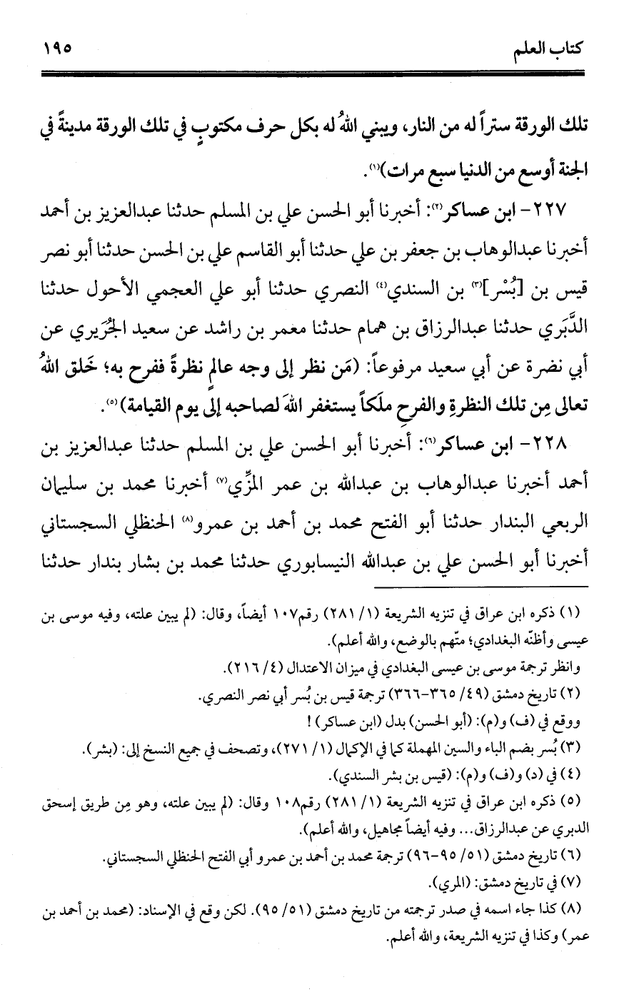 227 - ابن عساكر (¬1): أخبرنا أبو الحسن علي بن المسلم حدثنا عبد العزيز بن أحمد أخبرنا عبد الوهاب بن جعفر بن علي حدثنا أبو القاسم علي بن الحسن حدثنا أبو نصر قيس بن [بُسْر] (¬2) بن السندي (¬3) النصري حدثنا أبو علي العجمي الأحول حدثنا الدَّبَري حدثنا عبد الرزاق بن همام حدثنا مغمر بن راشد عن سعيد الجُرَيري عن أبي نضرة عن أبي سعيد مرفوعاً: (مَن نظر إلى وجه عالمٍ نظرةً ففرح به؛ خَلق اللهُ تعالى مِن تلك النظرةِ والفرحِ ملَكاً يستغفر اللهَ لصاحبه إلى يوم القيامة) (¬4).