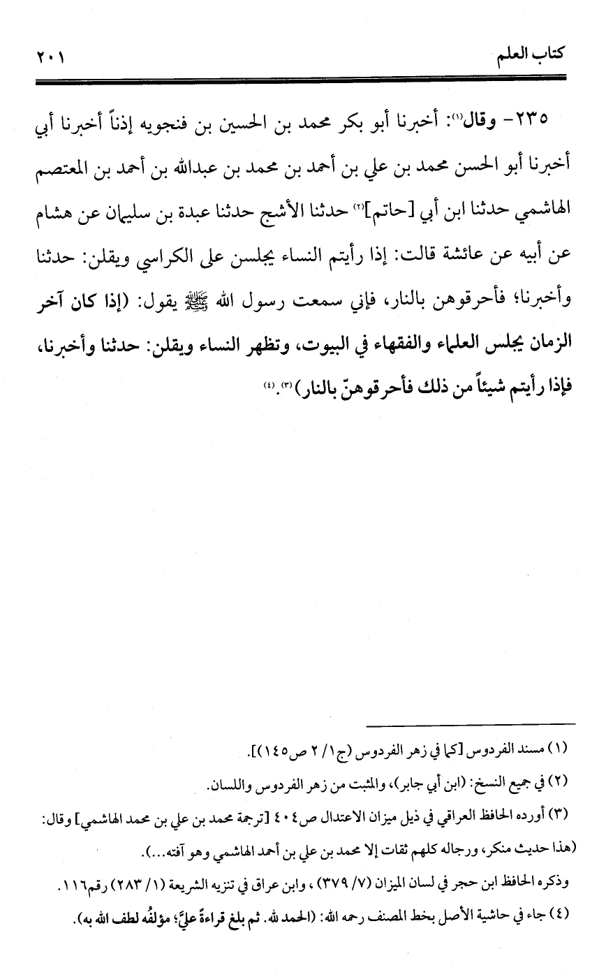 235 - وقال (¬1): أخبرنا أبو بكر محمَّد بن الحسين بن فنجويه إذنًا أخبرنا أبي أخبرنا أبو الحسن محمَّد بن علي بن أحمد بن محمَّد بن عبد الله بن أحمد بن الخصم الهاشمي حدثنا ابن أبي [حاتم] (¬2) حدثنا الأشج حدثنا عبدة بن سليمان عن هشام عن أبيه عن عائشة قالت: إذا رأيتم النساء يجلسن على الكراسي ويقلن: حدثنا وأخبرنا؛ فأحرقوهن بالنار، فإني سمعت رسول الله - صلى الله عليه وسلم - يقول: (إذا كان آخر الزمان يجلس العلماء والفقهاء في البيوت، وتظهر النساء ويقلن: حدثنا وأخبرنا، فإذا رأيتم شيئًا من ذلك فأحرقوهنّ بالنار) (¬3). (¬4)