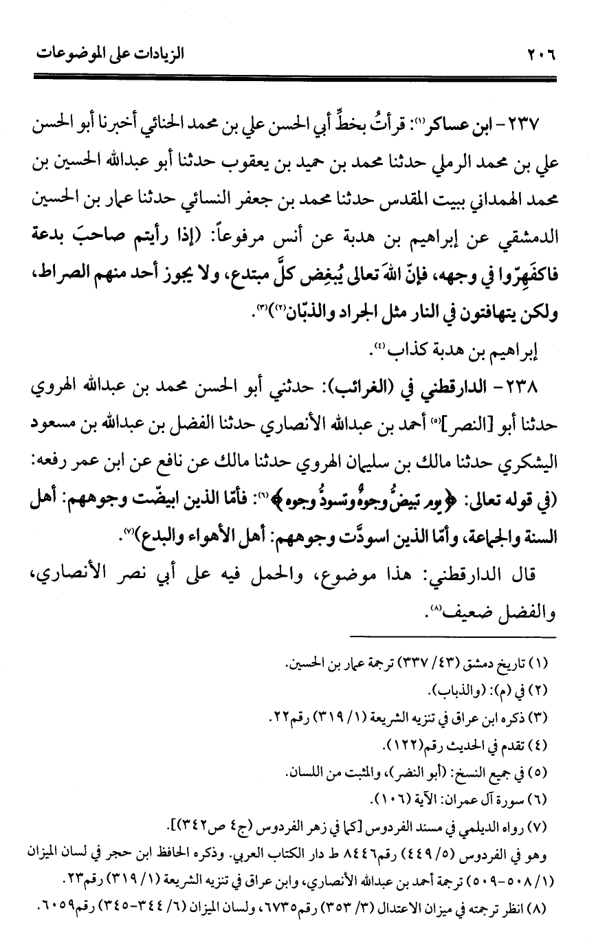 237 - ابن عساكر (¬1): قرأتُ بخطِّ أبي الحسن علي بن محمَّد الحنائي أخبرنا أبو الحسن علي بن محمَّد الرملي حدثنا محمَّد بن حميد بن يعقوب حدثنا أبو عبد الله الحسين بن محمَّد الهمداني ببيت المقدس حدثنا محمَّد بن جعفر النسائي حدثنا عمار بن الحسين الدمشقي عن إبراهيم بن هدبة عن أنس مرفوعًا: (إذا رأيتم صاحبَ بدعة فاكفَهِرّوا في وجهه، فإنّ الله تعالى يُبغِض كلَّ مبتدع، ولا يجوز أحد منهم الصراط، ولكن يتهافتون في النار مثل الجراد والذبّان) (¬2) (¬3).