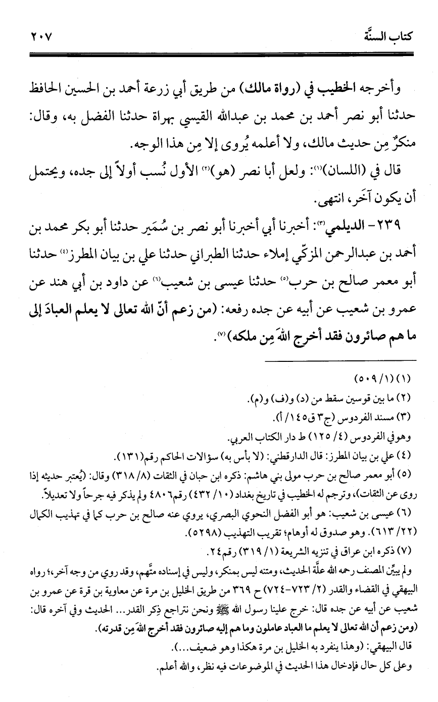 239 - الديلمي (¬1): أخبرنا أبي أخبرنا أبو نصر بن سُمَير حدثنا أبو بكر محمَّد بن أحمد بن عبد الرحمن المزكّي إملاء حدثنا الطبراني حدثنا علي بن بيان الطرز (¬2) حدثنا أبو معمر صالح بن حرب (¬3) حدثنا عيسى بن شعيب (¬4) عن داود بن أبي هند عن عمرو بن شعيب عن أبيه عن جده رفعه: (من زعم أنّ الله تعالى لا يعلم العبادَ إلى ما هم صائرون فقد أخرج الله مِن ملكه) (¬5).