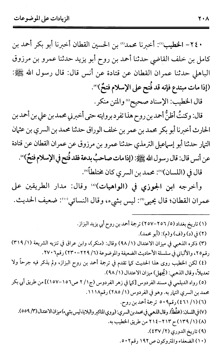 240 - الخطيب (¬1): أخبرنا محمَّد (¬2) بن الحسين القطان أخبرنا أبو بكر أحمد بن كامل بن خلف القاضي حدثنا أحمد بن روح أبو يزيد حدثنا عمرو بن مرزوق الباهلي حدثنا عمران القطان عن قتادة عن أنس قال: قال رسول الله - صلى الله عليه وسلم -: (إذا مات مبتدع فإنه قد فُتح على الإِسلام فتحٌ) (¬3).
