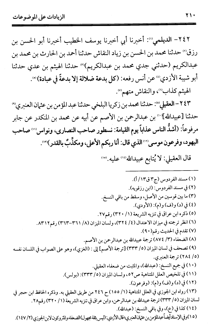 242 - الديلمي (¬1): أخبرنا أبي أخبرنا يوسف الخطيب أخبرنا أبو الحسن بن رزق (¬2) حدثنا محمَّد بن الحسن بن زياد النقاش حدثنا أحمد بن الحارث بن محمَّد بن عبد الكريم (حدثني جدي محمَّد بن عبد الكريم) (¬3) حدثنا الهيثم بن عدي حدثنا أبو شيبة الأزدي (¬4) عن أنس رفعه: (كل بدعة ضلالة إلا بدعةً في عبادة) (¬5).