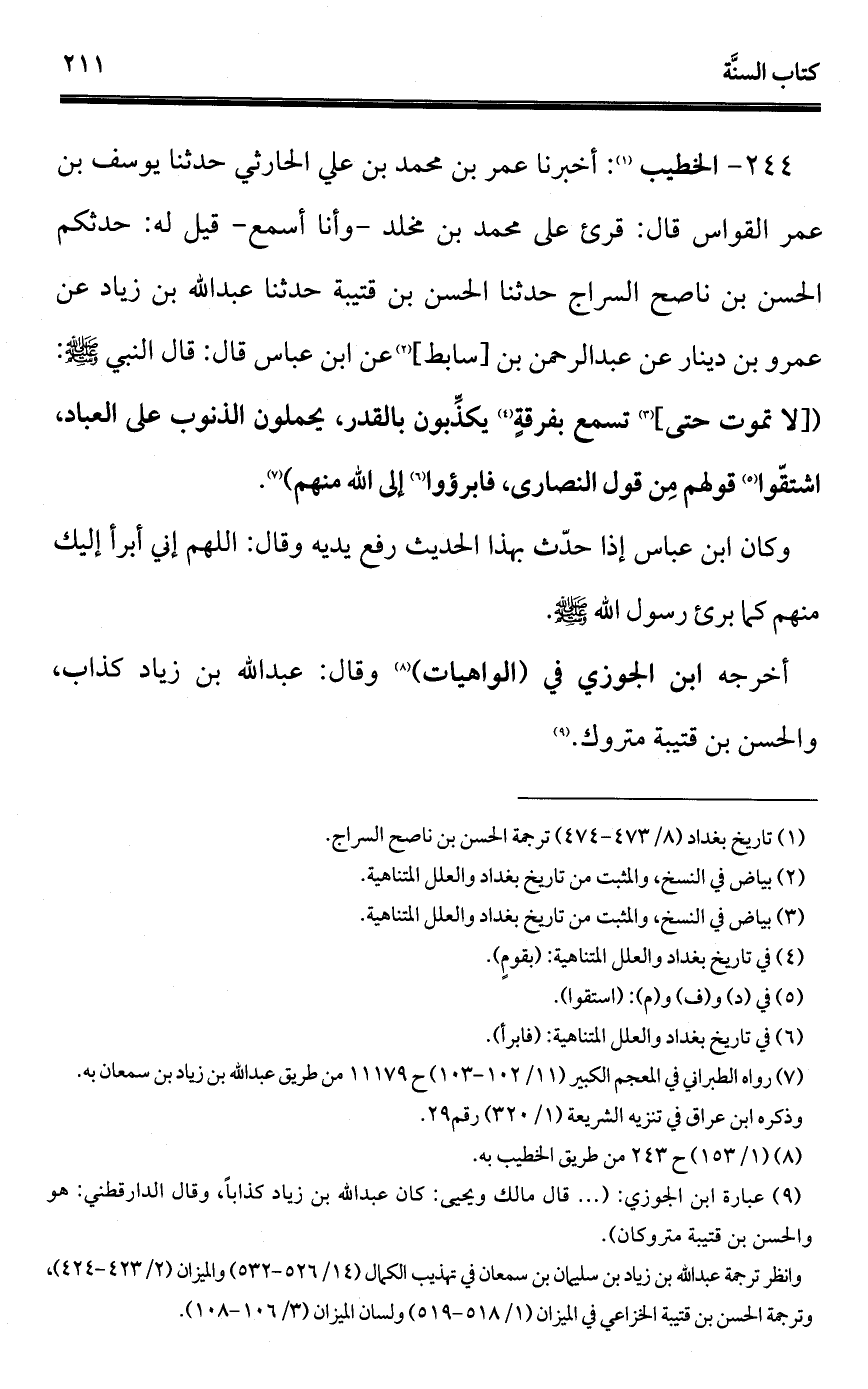 244 - الخطيب (¬1): أخبرنا عمر بن محمَّد بن علي الحارثي حدثنا يوسف بن عمر القواس قال: قرئ على محمَّد بن مخلد -وأنا أسمع- قيل له: حدثكم الحسن بن ناصح السراج حدثنا الحسن بن قتيبة حدثنا عبد الله بن زياد عن عمرو بن دينار عن عبد الرحمن بن [سابط] (¬2) عن ابن عباس قال: قال النبي - صلى الله عليه وسلم -: ([لا تموت حتى] (¬3) تسمع بفرقةٍ (¬4) يكذِّبون بالقدر، يحملون الذنوب على العباد، اشتقّوا (¬5) قولهم مِن قول النصارى، فابرؤوا (¬6) إلى الله منهم) (¬7).