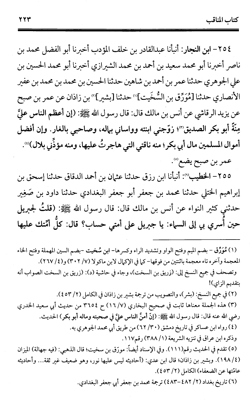 254 - ابن النجار: أنبأنا عبد القادر بن خلف المؤدب أخبرنا أبو الفضل محمَّد بن ناصر أخبرنا أبو محمَّد سعيد بن أحمد بن محمَّد الشيرازي أخبرنا أبو محمَّد الحسين بن علي الجوهري حدثنا عمر بن أحمد بن شاهين حدثنا الحسين بن محمَّد بن محمَّد بن عفير الأنصاري حدثنا [مُوَرِّق بن السُّخَيت] (¬1) حدثنا [بشير] (¬2) بن زاذان عن عمر بن صبح عن يزيد الرقاشي عن أنس بن مالك قال: قال رسول الله - صلى الله عليه وسلم -: (إن أعظم الناس عليَّ مِنّةً أبو بكر الصديق (¬3)؛ زوّجني ابنته وواساني بماله، وصاحبي بالغار. وإن أفضل أموال المسلمين مال أبي بكر؛ منه ناقتي التي هاجرتُ عليها، ومنه مؤذِّني بلال) (¬4).