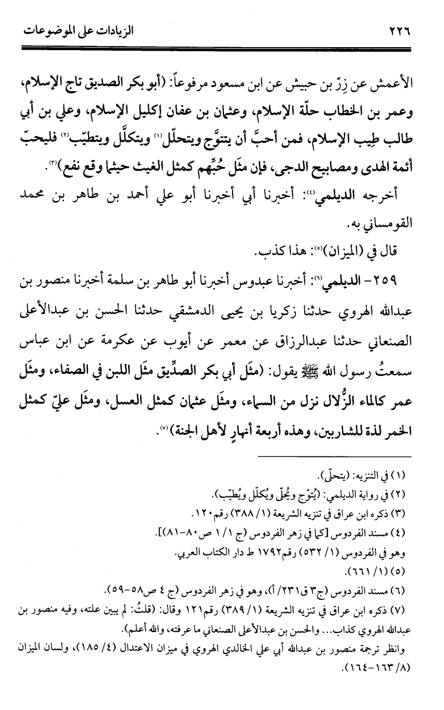 259 - الديلمي (¬1): أخبرنا عبدوس أخبرنا أبو طاهر بن سلمة أخبرنا منصور بن عبد الله الهروي حدثنا زكريا بن يحيى الدمشقي حدثنا الحسن بن عبد الأعلى الصنعاني حدثنا عبد الرزاق عن معمر عن أيوب عن عكرمة عن ابن عباس سمعتُ رسول الله - صلى الله عليه وسلم - يقول: (مثَل أبي بكر الصدِّيق مثَل اللبن في الصفاء، ومثَل عمر كالماء الزُّلال نزل من السماء، ومثَل عثمان كمثل العسل، ومثَل عليّ كمثل الخمر لذة للشاربين، وهذه أربعة أنهارٍ لأهل الجنة) (¬2).