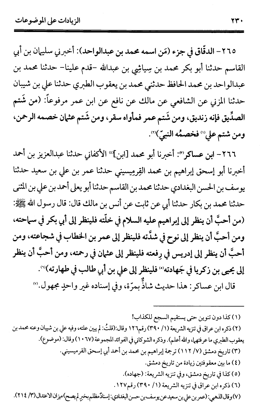 265 - الدقّاق في جزء (مَن اسمه محمَّد بن عبد الواحد): أخبرني سليمان بن أبي القاسم حدثنا أبو بكر محمَّد بن سِياشِي بن عبد الله -قدم علينا- حدثنا محمَّد بن عبد الواحد بن محمَّد الحافظ حدثني محمَّد بن يعقوب الطبري حدثنا علي بن شيبان حدثنا المزني عن الشافعي عن مالك عن نافع عن ابن عمر مرفوعًا: (من شَتم الصدِّيق فإنه زنديق، ومن شَتم عمر فمأواه سقر، ومن شَتم عثمان خصمه الرحمن، ومن شتم علي (¬1) فخصمُه النبيّ) (¬2).
