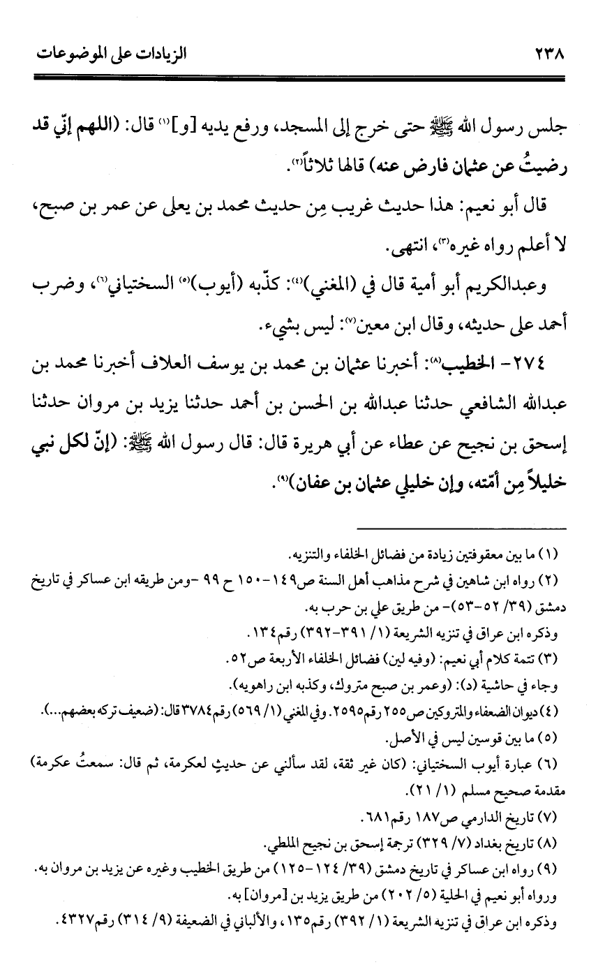 274 - الخطيب (¬1): أخبرنا عثمان بن محمَّد بن يوسف العلاف أخبرنا محمَّد بن عبد الله الشافعي حدثنا عبد الله بن الحسن بن أحمد حدثنا يزيد بن مروان حدثنا إسحاق بن نجيح عن عطاء عن أبي هريرة قال: قال رسول الله - صلى الله عليه وسلم -: (إنّ لكل نبي خليلاً مِن أمّته، وإن خليلي عثمان بن عفان) (¬2).