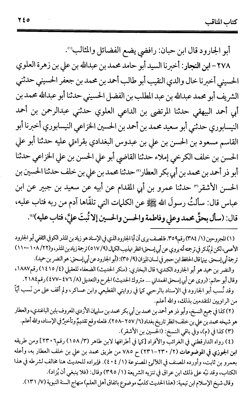 278 - ابن النجار: أخبرنا السيد أبو حامد محمَّد بن عبد الله بن علي بن زهرة العلوي الحسيني أخبرنا خال والدي النقيب أبو طالب أحمد بن محمَّد بن جعفر الحسيني حدثني الشريف أبو محمَّد عبد الله بن عبد المطلب بن الفضل الحسيني حدثنا أبو عبد الله محمَّد بن أبي أحمد البيهقي حدثنا المرتضى بن الداعي العلوي حدثني عبد الرحمن بن أحمد النيسابوري حدثني أبو سعيد محمَّد بن أحمد بن الحسين الخزاعي النيسابوري أخبرنا أبو القاسم مسعود بن الحسن بن علي بن عبدوس البغدادي بقراءتي عليه حدثنا أبو علي الحسن بن خلف الكرخى إملاء حدثنا القاضي أبو علي الحسن بن علي الخزاعي حدثنا أبو ذر أحمد بن محمَّد بن أبي بكر العطار (¬1) حدثنا محمَّد بن علي بن خلف حدثنا الحسين بن الحسن الأشقر (¬2) حدثنا عمرو بن أبي المقدام عن أبيه عن سعيد بن جبير عن ابن عباس قال: سألتُ رسولَ الله - صلى الله عليه وسلم - عن الكلمات التي تلقّاها آدم من ربه فتاب عليه، قال: (سأل بحقِّ محمَّد وعلي وفاطمة والحسن والحسين إلا تُبتَ عليَّ، فتاب عليه) (¬3).