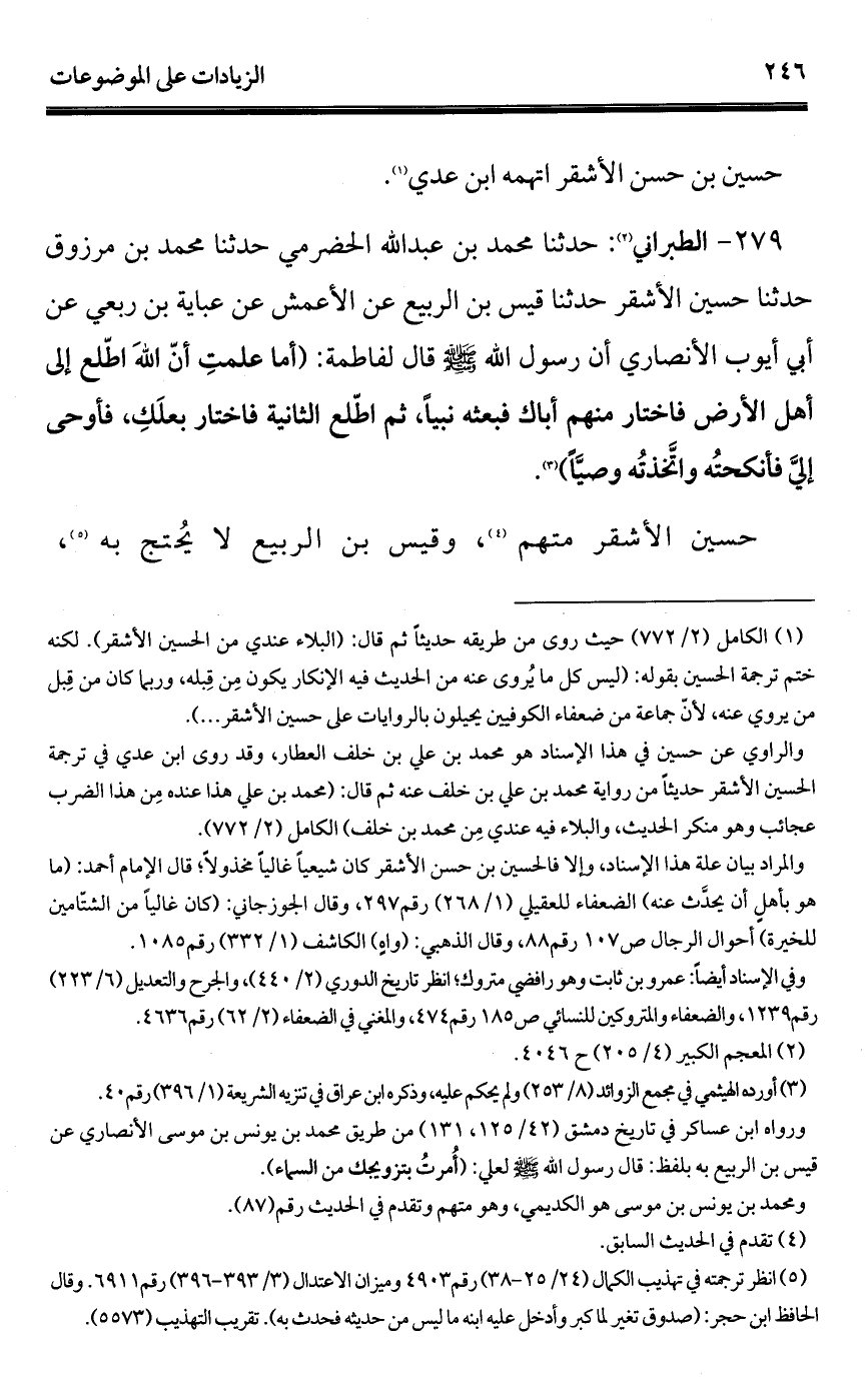 279 - الطبراني (¬1): حدثنا محمَّد بن عبد الله الحضرمي حدثنا محمَّد بن مرزوق حدثنا حسين الأشقر حدثنا قيس بن الربيع عن الأعمش عن عباية بن ربعي عن أبي أيوب الأنصاري أن رسول الله - صلى الله عليه وسلم - قال لفاطمة: (أما علمتِ أنّ الله اطّلع إلى أهل الأرض فاختار منهم أباك فبعثه نبيًا، ثم اطّلع الثانية فاختار بعلَكِ، فأوحى إليَّ فأنكحتُه واتَّخذتُه وصيًّا) (¬2).