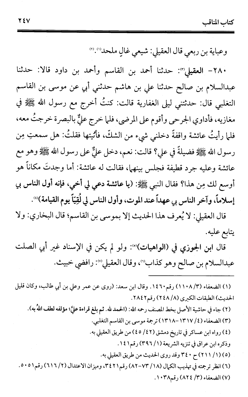 280 - العقيلي (¬1): حدثنا أحمد بن القاسم وأحمد بن داود قالا: حدثنا عبد السلام بن صالح حدثنا علي بن هاشم حدثني أبي عن موسى بن القاسم التغلبي قال: حدثتني ليلى الغفارية قالت: كنتُ أخرج مع رسول الله - صلى الله عليه وسلم - في مغازيه، فأداوي الجرحى وأقوم على المرضى، فلما خرج عليٌّ بالبصرة خرجتُ معه، فلما رأيتُ عائشة واقفةً دخلني شيء من الشكّ، فأتيتها فقلتُ: هل سمعتِ مِن رسول الله - صلى الله عليه وسلم - فضيلةً في علي؟ قالت: نعم، دخل عليّ على رسول الله - صلى الله عليه وسلم - وهو مع عائشة وعليه جرد قطيفة فجلس بينهما، فقالت له عائشة: أما وجدتَ مكاناً هو أوسع لك مِن هذا؟ فقال النبي - صلى الله عليه وسلم -: (يا عائشة دعي لي أخي، فإنه أول الناس بي إسلامًا، وآخر الناس بي عهداً عند الموت، وأول الناس لي لُقِيًّا يوم القيامة) (¬2).