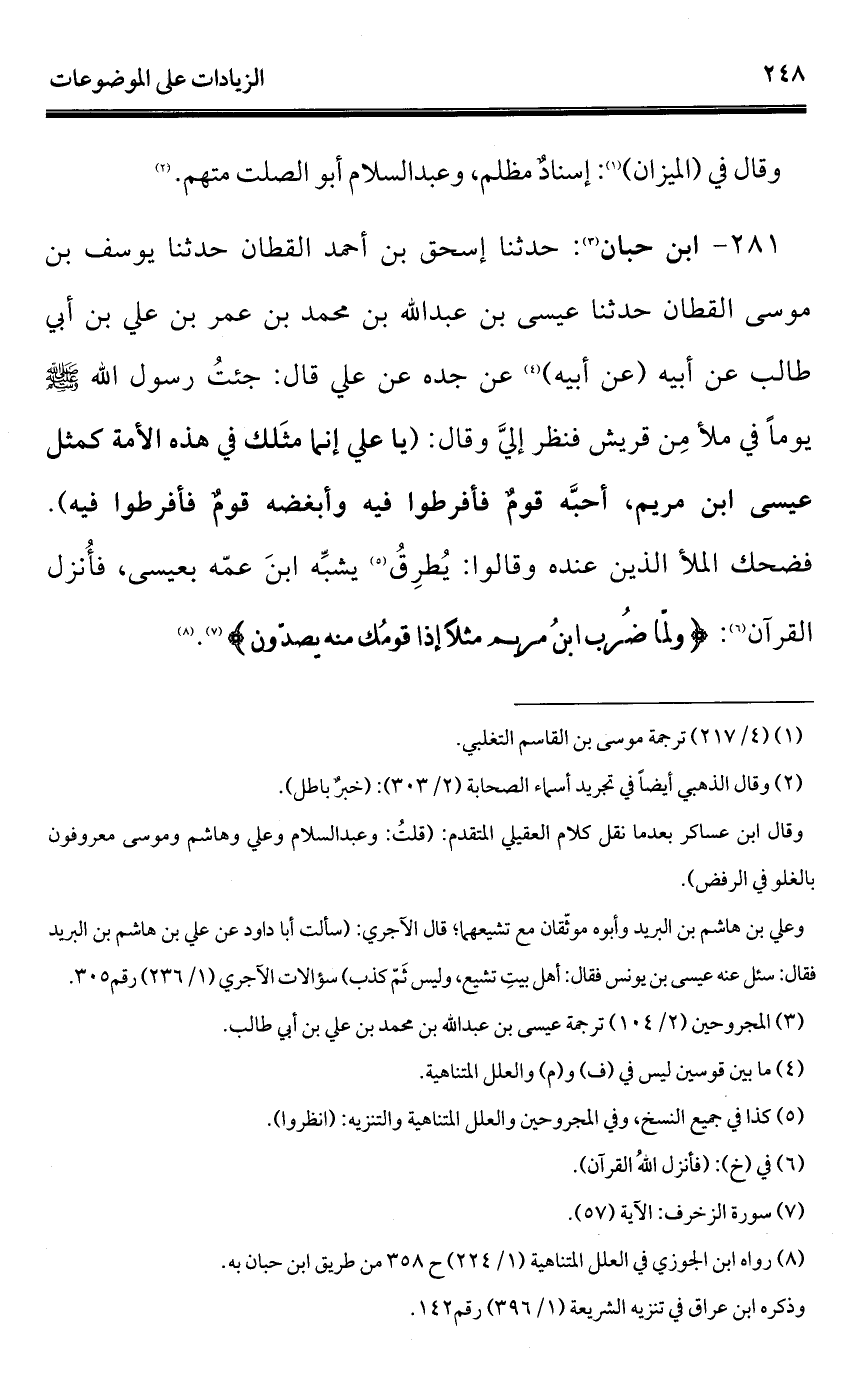 281 - ابن حبان (¬1): حدثنا إسحاق بن أحمد القطان حدثنا يوسف بن موسى القطان حدثنا عيسى بن عبد الله بن محمَّد بن عمر بن علي بن أبي طالب عن أبيه (عن أبيه) (¬2) عن جده عن علي قال: جئتُ رسول الله - صلى الله عليه وسلم - يومًا في ملأ مِن قريش فنظر إليَّ وقال: (يا علي إنما مثَلك في هذه الأمة كمثل عيسى ابن مريم، أحبَّه قومٌ فأفرطوا فيه وأبغضه قومٌ فأفرطوا فيه).