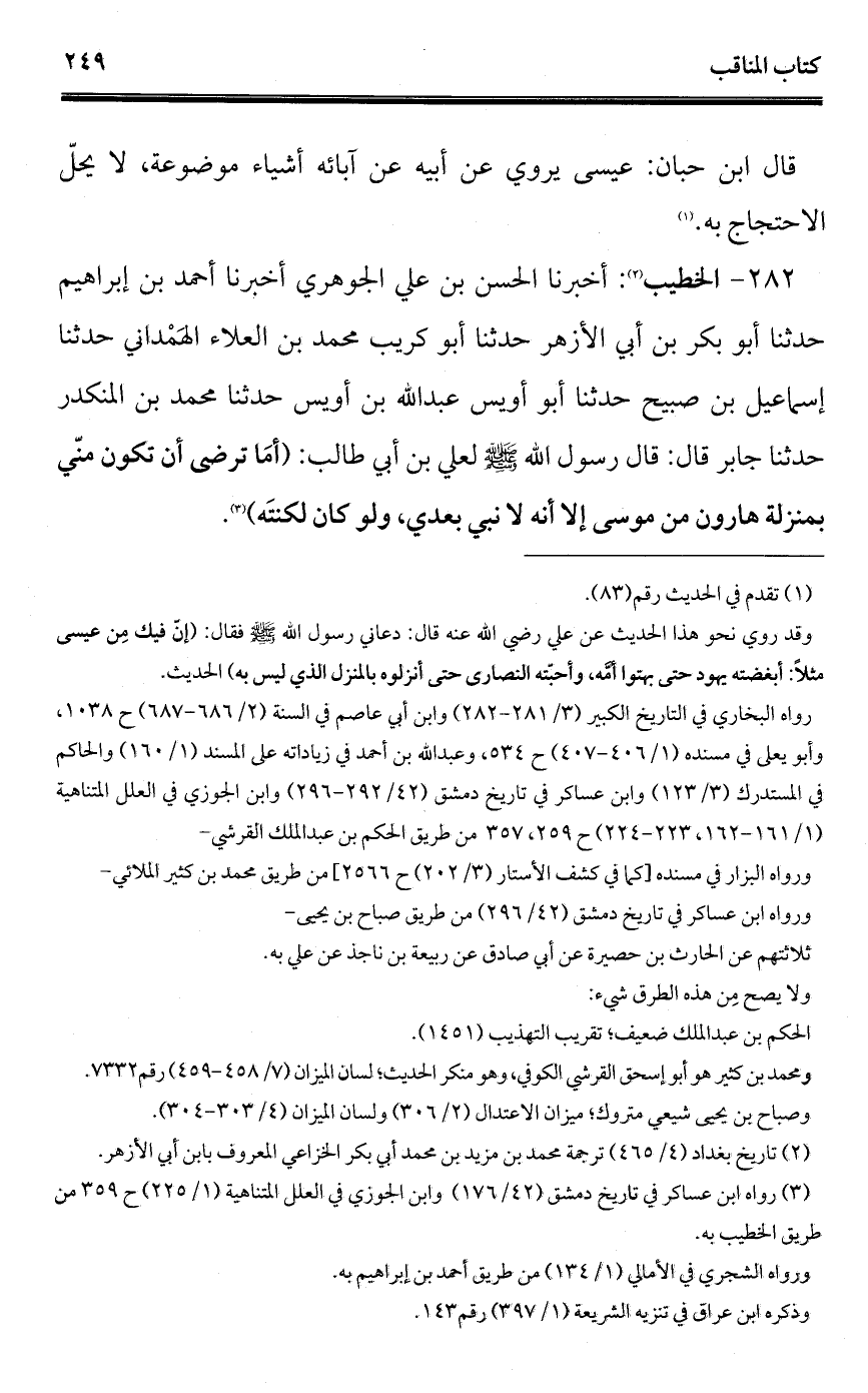 282 - الخطيب (¬1): أخبرنا الحسن بن علي الجوهري أخبرنا أحمد بن إبراهيم حدثنا أبو بكر بن أبي الأزهر حدثنا أبو غريب محمَّد بن العلاء الهَمْداني حدثثا إسماعيل بن صبيح حدثنا أبو أويس عبد الله بن أويس حدثنا محمَّد بن المنكدر حدثنا جابر قال: قال رسول الله - صلى الله عليه وسلم -حوّ لعلي بن أبي طالب: (أمَا ترضى أن تكون منّي بمنزلة هارون من موسى إلا أنه لا نبي بعدي، ولو كان لكنتَه) (¬2).