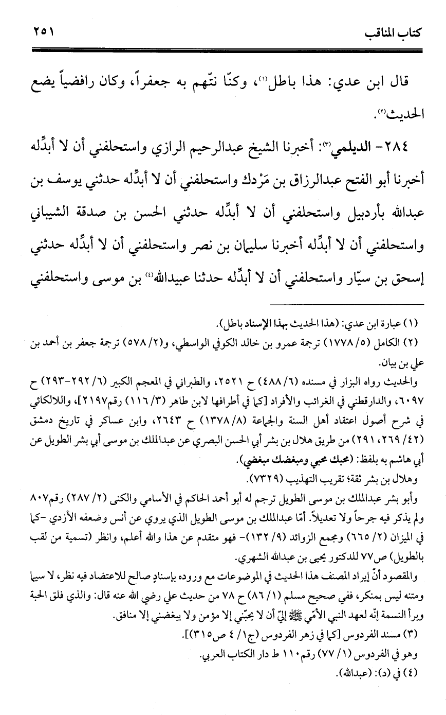 284 - الديلمي (¬1): أخبرنا الشَّيخ عبد الرحيم الرازي واستحلفني أن لا أبدِّله أخبرنا أبو الفتح عبد الرَّزاق بن مَرْدك واستحلفني أن لا أبدِّله حدثني يوسف بن عبد الله بأردبيل واستحلفني أن لا أبدِّله حدثني الحسن بن صدقة الشيباني واستحلفني أن لا أبدِّله أخبرنا سليمان بن نصر واستحلفني أن لا أبدِّله حدثني إسحاق بن سيّار واستحلفني أن لا أبدِّله حدّثنا عبيد الله (¬2) بن موسى واستحلفني