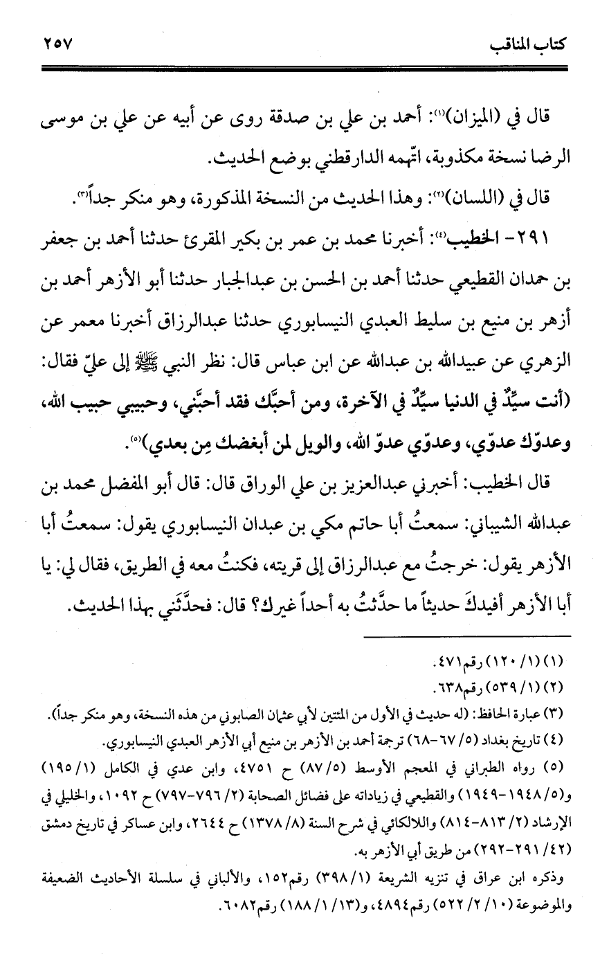 291 - الخطيب (¬1): أخبرنا محمد بن عمر بن بكر المقرئ حدّثنا أحمد بن جعفر بن حمدان القطيعي حدّثنا أحمد بن الحسن بن عبد الجبار حدّثنا أبو الأزهر أحمد بن أزهر بن منيع بن سليط العبدي النيسابوري حدّثنا عبد الرَّزاق أخبرنا معمر عن الزُّهريّ عن عبيد الله بن عبد الله عن ابن عباس قال: نظر النَّبيُّ - صَلَّى الله عليه وسلم - إلى عليّ فقال: (أنت سيِّدٌ في الدُّنيا سيِّدٌ في الآخرة، ومن أحبَّك فقد أحبَّني، وحبيبي حبيب الله، وعدوّك عدوّي، وعدوّي عدوّ الله، والويل لمن أبغضك مِن بعدي) (¬2).