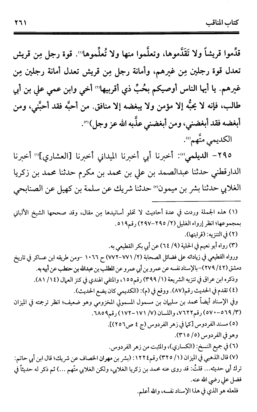 295 - الديلمي (¬1): أخبرنا أبي أخبرنا الميداني أخبرنا [العشاري] (¬2) أخبرنا الدارقطني حدّثنا عبد الصمد بن علي بن محمد بن مكرم حدّثنا محمد بن زكريا الغلابي حدّثنا بشر بن ميمون (¬3) حدّثنا شريك عن سلمة بن كهيل عن الصنابحي